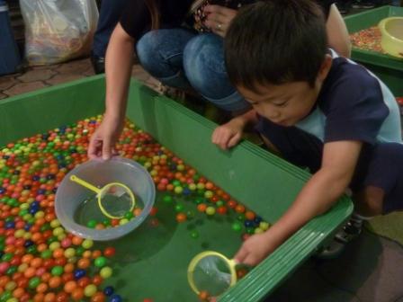 ちょうど、実家に帰っていた時に自転車で10分くらいのところでお祭りがあったのですごく楽しみにしていた諒真と謙真 早く行きたい諒真は「早くご飯食べるよ」と言っておばあちゃんのお手伝いをしていました 謙真は・・・汗がすごかったのでシャワーをしてすっきり「さぁ~着替えよう」と謙真の方を見ると・・・ 裸のまま爆睡していました諒真が「お祭り行くよ」と起こしても起きないので・・・おじいちゃんとお留守番 会場に着くと・・・すごい人たこせん(50円)以外すべて100円のお祭り 早速、スパーボールすくいをして10個以上取れました そして、2個持って帰ってもいいので「諒真くんは緑で~ 謙真くんには黄色にするわ~」と ちゃんと謙真にもお土産を忘れない諒真でした かき氷が大好きな諒真は「かき氷やー食べたい」と言うのでお母さんにもくれる条件で一緒に食べました 光るおもちゃが欲しくて、当て物に挑戦見事ゲット出来た諒真は大喜び 「謙真くんにもいるなぁ~」と言ってもう一度挑戦2等が当たり鍵付きのノートをゲット たこせんも食べて大満足の諒真でした 家に帰って謙真にスーパーボールを渡し光るおもちゃを貸してあげていました