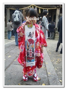 13日の土曜日に、Nachaの七五三のご祈祷に行ってきました。早生まれなので、去年はちょっと難しいかな?って思い、今年にしました。美容院に行ってもジッとしていられないだろうから、髪のセットと着付けは自分でしました。着物は私の母が用意してくれました。(ありがとう)朝から着物が着れる~ってルンルンだったのに、神社に着くころにはややお疲れに・・・写真もろくに撮らせてもらえず・・・これ↑もかなりふてくされ顔ですお兄ちゃんとのツーショット。女の子はやっぱり着物率高いですね~。みんな今時の色柄でかわいいけど、なんだか大人っぽすぎて逆に子供らしさが・・・・って思うのは私だけ?うちはどちらかというと昔風な感じですが、私は子供らしくてこっちの方が好きです。また一つ子供の成長の区切りを無事迎えることができて良かったです。