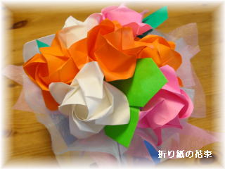 昨日、Ryoにとって悲しい別れがありました。大好きだったHちゃんがお父さんの仕事の都合で引越する事になり、昨日、引っ越し先へと出発していきました。最後にお別れしに行きたいって言うので、出発前に会ってきました。会いに行くとHちゃんもとても喜んでくれて、二人で楽しく遊んでました。でも、そろそろ帰ろうかって頃になると、二人とも寂しそうに・・・Hちゃんはちょっと泣いてしまって、Ryoはぐっと我慢してました。そんな二人を見て涙する母。。。お互い転勤の可能性がある立場なのはわかってたから、いつかはこんな日が来るだろうとは思ってたけど、ちょっと早かったな。。。帰り道、”悲しかったけど、男の子だから泣かない””でも、夏休みに別れるときは泣いちゃうかも”って・・・そうなんです。夏休みに幼稚園で卒園児の同窓会があって、それにHちゃんも来るって聞いてたので、その事もあって泣くのを我慢できたみたいなんです。そうだよね。あんなに大好きだったんだもんね。悲しくないはずがない。でも、遠く離れても大好きな友達には変わりない。いつまでも大切な友達だよ。お別れに、お花でもって思ったけど、生花では長距離移動には困るし、プリザーブドは?って思ったけど、あまりいいものが無くて・・・どうしようかな~って考えてたら、Ryoが”紙で作る?”って。ちょうどその時、某CMで折り紙のチューリップを見て、コレだ!!って。早速ネットで折り紙の花束を検索したら、福山ローズなるものがヒット。作り方も詳しく載ってたので、これを参考に折ってみました。こんな感じのミニ花束が出来上がりました。これなら枯れないし、しばらく飾っててもらえるかな?