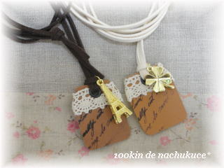 100均のアイテムでナチュなアクセを作りました。材料はセリアのもの。(あ、ハトメはダイソー品。210円也)皮タグのようなのは、鞄の持ち手を付ける補強用(であってるのかな?)の合皮。持ち手と同じ所に置いてあります。角カンとセットで2個入り。他に黒もあり。ソフトタイプとハードタイプがあって、左側がソフトタイプ。ハトメを止めるのには薄いソフトタイプの方が止めやすかったです。合皮にスタンプ押して、レースを付け、チャームを添えてみました。このゴールドのチャームは新入荷品かな?以前からあるアンティークゴールドの鍵チャームのところで見つけました。右側のオフホワイトのレザー紐もセリア品。他にピンクと水色も見かけました。茶はないみたい。あったらいいのにな・・・・といつも思うのです。茶の方は手芸屋さんで200円弱だったかな。本革だと結構しますよね・・・セリアはナチュラルな素材がたくさんあるので、行くたびに色々チェックして何かしら仕入れている今日この頃。プチプラでちゃちゃっと作れるナチュアクセ。かなりはまってます