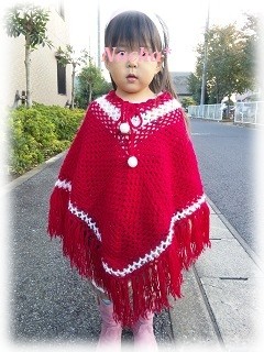 寒くなってきたので、防寒用にポンチョとネックウォーマーを作りました。ポンチョはNacha用に、編みました。真っ赤な糸で、縁に白いラインを入れて、サンタちっくにしてみましたちょっとクリスマスっぽいでしょ?編み図は【毛糸 ピエロ】 メーカー直販店の編図を参考にしました。「作品サンプル」にたくさんの編み図が公開されています。このポンチョは、「作品サンプル」→「ベビー&キッズ」→「ウェア」の28-29-46の編み図を参考にしてます。Ryoも欲しいって言ったので作ったのですが、なぜか同じ物なのに、2着目は進みが遅く、フリンジが途中の状態で止まってます・・・同じ物だと飽きちゃうみたいです、私。早く仕上げなきゃもう一つネックウォーマーを。まずためしにRyo用に作ってみたら、これが好評で、私も試着してみたら、めちゃめちゃあったかかったので、自分用とNacha用も追加製作。上の水玉のがNacha用。Nachaも毎日登園時に使ってくれます私も毎朝使ってて、めちゃめちゃあったかいので手放せません~。マフラーもいいけど、動き回る子供には、ほどけてどこかに挟まったり、引っかかったりしないので、こっちのほうがいいですね。でも、女の子は着脱時にヘアースタイルが崩れるかも。ワンポイントにつけたイニシャルレースはSeriaのものです、ちょうど、NとM(私のイニシャルです)のイニシャルがあったので即買いしました。RyoのRもあったので買ったけど、男の子には使わないよね・・・NとMはたまたまモチーフが同じ形でしたが、他のイニシャルは違う形でしたよ。2枚入りで100円は安いのかな?もう一回り小さいサイズもあるとうれしいいけど・・・珍しくパパさんからもネックウォーマー頼まれてるんだった・・・早く作ってあげなきゃ