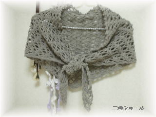 随分長い間放置してしまいました・・・・・ま、このブログを楽しみに読んでくれてる人はいないと思うけど・・・・放置している間にブログタイトルだけ変更していました。以前の「ナチュラルライフ」では、何かタイトルだけかっこよくて中身は?????だったので、ナチュ勉強中で、もっと気楽な感じのタイトルに変更しました。放置中にお買い物したモノをUPするつもりだったけど、季節が完全に過ぎてしまったので割愛しちゃいます。代わりに、と言っては何ですが、最近編んだものを紹介しますね。先ずはこれ↓最近おしゃれなナチュラルさん達が活用しているアイテム”三角ショール”参考にしたのはこれ↓かぎ針編み秋冬この中の三角ショールをちょっとだけ簡単にアレンジしました。肩にさっと羽織るだけでなんだかナチュラルさんになった気分にまだまだコーディネートは勉強しなくちゃ、だけど・・・おしゃれなブロガーさんを参考に勉強させてもらいます。もう一つこれ↓玉編みのトートです。これは実母へのプレゼント。母がお友達からどっさりと毛糸を頂いたらしく、何か作れない?と言って送ってきたダークグレーの極太糸でザクザク編みました。母から、ESSEの10月号でともさかりえちゃんが持っていたのみたいなのがいい、とリクエストされ、ESSEとにらめっこして何とか形にしてみました。若干いびつだけど、編み図もなく手探りで編んだ割にはまずまずじゃないかな?A4サイズがギリギリ入るかどうかってくらいのサイズです。見た目は目が詰まってるように見えるけど結構隙間が出来るので内布は必要かも。ま、縫い物は母の方が得意(てか、プロだし・・・)なのでお任せ。果たしてお眼鏡にかなうだろうか・・・・