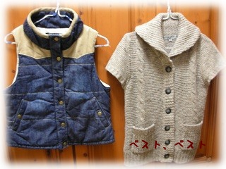 先日久しぶりにしまむらへ行って、ベストを2着購入しました。こちら↓デニムの中綿ベストとニットベストです。ベストを2つも・・・って思ったけど、カジュアルなデニムも、ナチュラルなニットもどっちも気に入ってしまって、結局2つとも買ってしまいました。ニットベストは、この色のほかに、茶とグレーがありました。こちら、あったか素材だそうで、確かに暖かい気がします他にもトナカイ柄で同じような形のもあって、それと迷ってこっちにしました。 この↓ベストいいな~って思ってたけど、お値段が・・・bulle de savon ビュルデサボンポケット付き丸襟ニットベスト ちょっと袖が付いてるけど、雰囲気が似てるし、お値段1,470円なら買いでしょ~ デニムベストは、maman styleさんのこちら↓に似てて、お値段1,870円でした3045円(税込)いらないかもしれないけど、着画も撮ってみました今日着てた服の上に羽織っただけなので、コーディネートがおかしいですが・・・デニムベストに合わせるベージュのチノパンが欲しいです・・・またしまむらで探してこようかな・・・・
