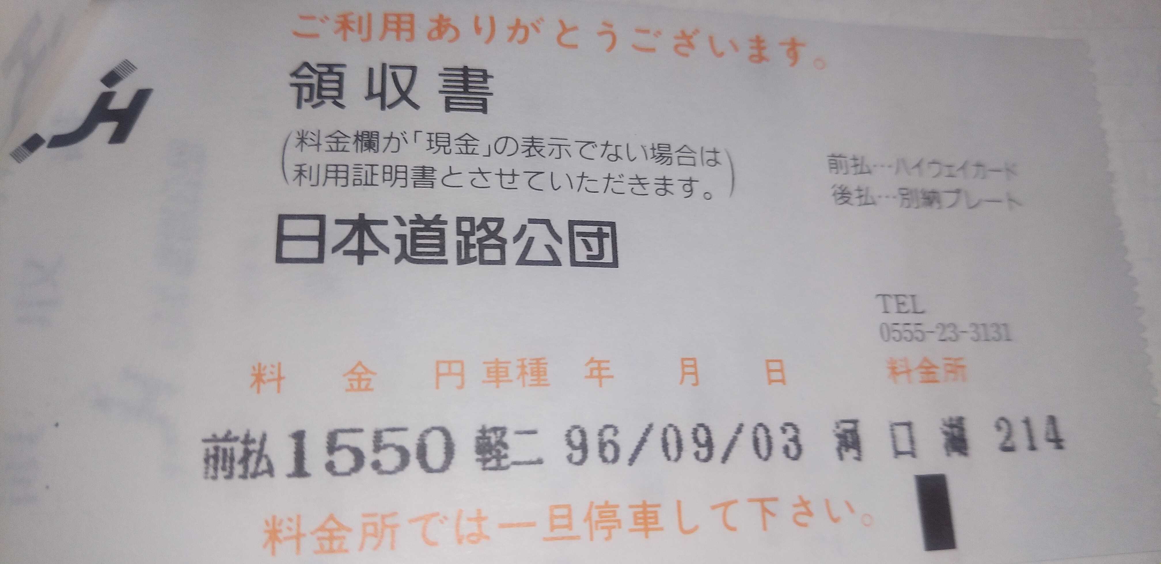 🌤こんにちは😸日曜日、今日も暑いです🍧💦さてさて、行ったことがあるSA・PA・IC編です。1996年9月のツーリングレポートの続きです。東名高速道路・御殿場ICから、🙋高速道路へ乗った私です。ここから、東名高速道路、首都高速道路、常磐自動車道を走り帰路につきます。乗って直ぐの足柄SAへ。PM4:10 東名高速道路・足柄SA(上り)⬇⬇⬇〒412-0023 静岡県御殿場市深沢字前沢1801−1スタンプ👤ゲット!!⬇⬇⬇空いている。二年前に来たときよりキレイに🆕リニューアルされていた。駐車場🅿も広くて停めやすいです。この当時は、昨今の道の駅やサービスエリアブームも無く普通のサービスエリアでしたなー、、、スタンプ👤と自撮り🤳して、出発!!次は、海老名SAです。PM5:05 東名高速道路・海老名SA(上り)⬇⬇⬇〒243-0418 神奈川県海老名市大谷南5丁目1−1やはり、有名どころのサービスエリア、🙌🙌🙌混んでいる!!暗くなる前に首都高速道路を抜けたかったので、スタンプ👤とトイレ🚻を済まして直ぐ🔜出発!!が、、、しかし、、、本線へ入り直ぐに事故渋滞の電光掲示板が!!横浜IC~東名川崎IC事故渋滞2km⊿とのこと。カビィ~ン(ToT)/~~~事故渋滞の脇をすり抜けで交わしていく。ワゴン車が横転していて2車線を塞いでいた。フロントガラスが粉々💥でした。1台だけの事故らしい、急ハンドルで横転したのかな?と、思いながら先へ≡≡≡ヘ(*--)ノ急ぐ💨PM5:40 東名高速道路・東京用賀料金所⬇⬇⬇〒216-0024 神奈川県川崎市宮前区南平台1−1−1 東京本線料金所チカレタ~😰なんとか、暗くなる前に首都高速道路へ入れる。東名高速道路・領収書⬇⬇⬇首都高速道路は、池袋辺りからまた渋滞🐌💨に、ここもすり抜けで交わしていくが、首都高速道路のすり抜けはヒヤヒヤものです。この狭い首都高速道路をすり抜けするのは🙏勘弁願う気持ちです。バイク便のライダーはいとも簡単にすり抜けしていくけど、私は🆙ギブアップしました。俗に言う絞りハンドルとは、バイク便が渋滞🐌💨のクルマの脇をすり抜ける為に考えられたものだとか。クルマにぶつからないように、ハンドルを狭める行為です。それを、族車が真似したんだとか、、、それもまた、狭い日本での文化なのですね。そんなこんなで、首都高速道路を抜けて、常磐自動車道へ。PM6:44 常磐自動車道・三郷料金所〒341-0013 埼玉県三郷市小谷堀🌃暗くなってきた。直ぐの守谷SAへGo💨PM7:00 常磐自動車道・守谷SA(下り)⬇⬇⬇〒302-0117 茨城県守谷市野木崎97−3ライダーが何人か来ていました。そのうちの一人、ビラーゴのライダーに話しかけられる。「ツーリングですか~?」と、彼は、福島県いわき市まで帰省すると言っていた。帰省ってしたことないからいいですよね~。(万年実家暮らしの私)「気を付けて~」と別れ、彼が先に出発していった。私も、スタンプ👤を押して出発!!PM7:30 常磐自動車道・谷和原IC〒300-2435 茨城県つくばみらい市筒戸ここで高速道路を降りて、R294へ。ここからは、栃木県二宮町(現真岡市)まで、一本道です。慣れた道、🐌💨スイスイ飛ばす。PM8:24 自宅着チカレタ~💦お疲れさま(。・_・。)ノです。これにて、1996年9月のツーリングレポートは完結です。おしまい🏁《ツーリングデータ》⬇⬇⬇走行距離 524.3km一日で500km超は、疲れます(T-T)💦💧《ツーリングデータ》1996年9月3日(火曜日)訪問私は、22歳です。《マシン》CB1000SF《ルート》自宅=小山=R4=古河=R125=加須=鴻巣市=吉見=関越自動車道・東松山IC=高坂SA=鶴ヶ島JCT=圏央道=青梅IC=R16=中央自動車道・八王子IC=談合坂SA=大月JCT=河口湖IC=R138=R137=河口湖=山中湖=R138=セブンイレブン=R138=御殿場=R138=R1=小田原=ターンパイク=大観山ドライブイン=椿ライン=箱根峠=芦ノ湖スカイライン=湖尻峠=箱根スカイライン=長尾峠=R138=御殿場IC=足柄SA=海老名SA=東京用賀料金所=首都高速道路=常磐自動車道=守谷SA=谷和原IC=R294=自宅ではでわ、午後も一日ご安全に!!🌽🍆🍅🎐🍉2025.8.31.日