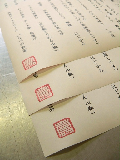三重県いなべ市の日本料理店より、本日23日土曜の仕入れ風景をあれこれ・・・。「活き伊勢海老」入荷。とっても活きのイイ伊勢海老。なんとか整列させて、写真撮りました。伊勢海老って「ギーギー」って鳴くんですよ。結構大きな声で。ご存知ですか?「石鯛」入荷。本日は、2,1キロサイズ。石鯛っていえば、もっとシマシマのイメージですが、魚体が大きくなると、消えていくそうです。歯は、とっても丈夫そうですね。石をも噛み砕くそうです。→石鯛真鯛の歯とは、また違った感じなんですよ。他、まぐろ ハモ 活けタコ 真鯛 など入荷しました。「遊楽の印(遊印)」、先日入荷しました。今回仕入れたのは、夏バージョンです。お昼の3名様のお献立には、ライトグリーンの紙に「あじさい」を捺しました。名付け披露宴のお客様には、おめでたくピンクの紙に「祝」を捺しました。お献立は、プリンタやコピー機で毎日印刷していますが、遊印は、私が一枚ずつ捺しています。「ご来店ありがとうございます」の気持ちを込めて・・・。以前仕入れた「遊印」はコチラ。本日のお料理の様子は、後ほど! 料理長