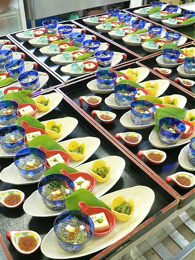 今週から始まりました「皐月・水無月のお献立」。当店HPで内容(一番人気の5500円の懐石コース)をご紹介しております。本日土曜のお昼は、ご法事お二組様。地元北勢町とお隣多度町から22名様 30名様 の合計52名様でした。「前菜」の準備ができ、お料理スタートの瞬間です。内容は、・秋田森岳直送生じゅんさい 二杯酢ゼリーをかけて・・・・さざなみピーマン(自家製ちりめん山椒とピーマンの炒め和え)・自家製やわらか玉子豆腐 美味出し いなべのうすい豆 京都祇園原了核の黒七味でした。本日もたくさんのご来店ありがとうございました。お昼のお客様から「吉兆で修行されたんですね。その節は・・・」って。なかなか厳しいお言葉ですね。最近ではグッと少なくなりましたが、やはり皆様の記憶には悪いイメージが残っていますね。そのたび、ショックを受けます。 私は、神戸吉兆グループで修行ですよ~。そして、12年前に退社していますので・・・。ご主人も女将さんも先輩もとっても厳しくいい方ばかりで、イイ修行生活を送りました。とにかく、いなべで頑張りましょう! 明日日曜は、「秋田森岳直送生じゅんさい 二杯酢ゼリーかけ」をご紹介致しま~す。料理長