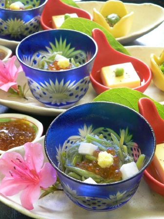 三重県いなべ市の日本料理店より 本日のお料理をご紹介して参りましょう。「前菜」です。内容は、・秋田森岳直送生じゅんさい 二杯酢ゼリーをかけて・・・ 長芋 白木耳 生姜 イクラ・いなべの産みたて卵の玉子豆腐 美味出し 京都祇園原了郭の黒七味・自家製ちりめん山椒とピーマンの炒め和えでした。庭の「モクレンの若葉」と「サツキ」をあしらって 『THE いなべ』!!!「お造里」は、有田焼の器に氷を敷いて・・・。内容は、いさきの炙り造り ほうぼう 自家製とろとろ生湯葉 生うに いさきの卵の一味焼き 叩きオクラ いなべの独活 いなべの人参 菊花 茗荷 本わさび 土佐醤油 でした。「人参の葉」「隅田の花火」「員弁川の小石」をあしらって、 再度 『THE いなべ』!!!本日もご来店ありがとうございました。 料理長