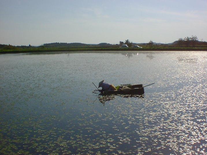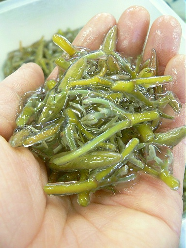 「皐月・水無月のお献立」に登場する生じゅんさい。秋田県森岳から直送してもらっています。収穫風景も出荷元から送ってもらいました。収穫も選別も手作業。とにかくお疲れ様です。色出し(ボイル)前色出し後緑鮮やかですね。鮮度がいい証です。↑ 皐月・水無月のお献立の「前菜」です。(3800円のミニ懐石から全てのコースに含まれます)一番左側の切子の器に盛り付けてあるのが、生じゅんさい。・白木耳・長芋(そのうち らっきょに替わるかも)・イクラ ・卸し生姜など、歯ごたえの楽しい食材と盛り合わせ、より爽やかな風味に・・・。『二杯酢ゼリーかけ・・・』↑ 二杯酢です。・一番だし・濃口・お酢・昆布 が入っています。 書けませんが、吉兆の分量で仕込んでいます。とっても美味しい二杯酢、酢の物全般に最高ですね。 「飲めるお酢」です。そして、「二杯酢ゼリー」。ゼラチンを加えて、冷し固めた後、細かく刻みました。都会的に言うと、二杯酢のジュレ でしょうね。田舎の高齢のお客様には説明し難いので、ゼリーとしています。 まさに 「食べるお酢」ですね。切子の器に二杯酢ゼリーをかけて、よく混ぜて召し上がれ!爽やかな初夏の味がしま~す。 料理長