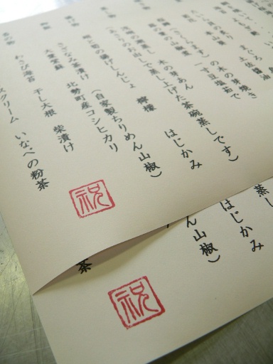 本日(6日)は、連休最終日。・ご結婚披露宴・ご法事 のご予約を頂戴していました。ご結婚披露宴のお献立には、『壽 ことぶき』の遊印を捺して・・・。ピンク色の紙ですよ。ご法事のお献立には、『杜若 かきつばた』の遊印を捺して・・・。こちらは、ベージュ色の紙です。来週くらいから、ライトグリーンのお献立用紙に替わることでしょう。今日はどちらも12時の御予約。手前、ご結婚披露宴の「八寸」向こう側 ご法事の「前菜」。スタート直前の様子です。鶴や亀の器 扇形の水引 をあしらってオメデタク・・・。本日のいなべの彩りは、「モクレンの若葉」ですね。「お造里」です。↑ ご結婚披露宴 31名様は、紅白に・・・。↑ ご法事 13名様は、少し地味目に・・・。庭の「姫菖蒲の葉」をあしらっています。本日はどちらのお席もこちら いなべ市北勢町阿下喜地内のご家族。地元のお客様、やはりありがたいですね。ご来店ありがとうございました。年末からゴールデンウィークまで、毎年大忙しの半年間です。なんとか、連休も無事終了しました。夜は、若女将と若女将の母とゆっくり飲んで語らいました。半年間の緊張感。料理長としての責任感。とにかくホッとして、美味しく飲めました。どっと疲れが出ないよう、明日からも気を引き締めて参りましょう! 料理長