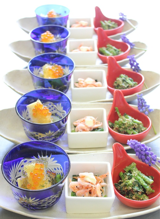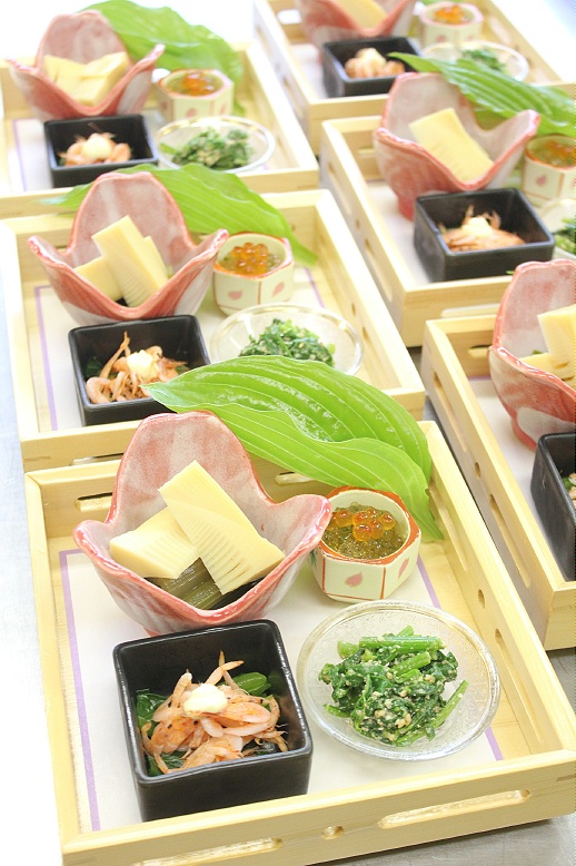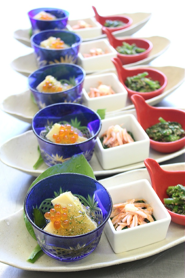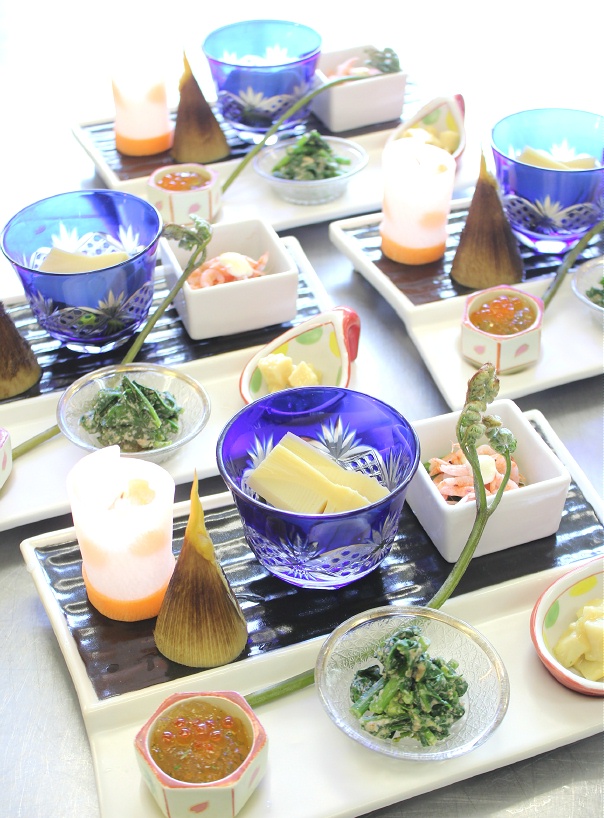 三重県最北端いなべ市の日本料理 昭栄館の料理長のブログです。本日は、ご法事をはじめ、同級会(58~59歳) 常連のご夫婦様、昇進祝いのご家族様 両家顔合わせなど、約50名様のご予約でした。お料理風景を一部ご紹介して参りましょう。ご法事 11名様の「前菜」です。庭で採りたてのギボウシの若葉をあしらって・・・。内容は、お献立(お品書き)をご覧下さい。 当店一番人気の雅会席でのご予約でした。常連のご夫婦様もご来店。年に4~5回お越し頂いています。前回は、3月10日でした。ご夫婦仲良く、「前菜」は、二名様一盛に・・・。前回3月10日は、春の雰囲気。今回は、端午の節句 初夏の雰囲気でご用意。 庭で採りたての姫菖蒲の葉、私が折った兜をあしらって・・・。よくお越しい頂くお客様なので、お料理・器・飾りつけも少しアレンジしています。「お造里」です。庭で採りたての青もみじ(まだこの時期、出たてでフニャフニャしています。) をあしらって・・・。内容は、左側から・北海道産生うに 本山葵 土佐醤油・高知室戸産 初鰹 いなべのこごみ 茗荷 卸し生姜・富山湾産 釜揚げ蛍烏賊 いなべのわさび菜 芥子酢味噌 でした。「ご飯もの」は、春菜寿司 と 赤だし をご用意。春菜寿司(しゅんさいずし)・・・寿司飯(いなべ産コシヒカリ)に・つけ焼きした走り鱧(はも)・蕗 ・いなべの菜花・自家栽培の山椒を混ぜ込んでいます。(筍も入れたいところですが、少しお苦手のようで・・・)トッピングには、駿河湾産 釜揚げ桜海老 自家栽培の山椒の木の芽を。 春の香りいっぱいの混ぜ寿司 春菜寿司で~す。本日もたくさんのご来店ありがとうございました。明日29日日曜は、ここ数年で最高 135名様のご予約を頂戴しています。・ご法事 3組様・ご結納 2組様・米寿のお祝い・ご結婚披露宴 です。(早くから満席のため、たくさんお断りしました。申し訳ありません。) 大忙しの一日になりそう~。 張り切ってお料理して参りましょう! 料理長
