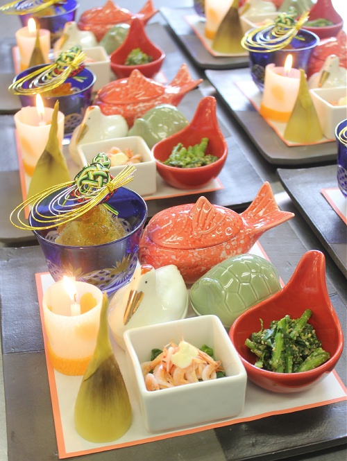 三重県最北端いなべ市の日本料理 昭栄館の料理長のブログです。本日(4月14日友引)は、お食い初め他、ご結納6名様 ご結婚祝い6名様 などお祝いのお席もたくさんございました。 ↑ 写真は、特別会席の始めのお料理「ぼんぼり八寸」です。鶴 亀 鯛のオメデタイ器(それぞれお料理を盛り付けています)、子持ち昆布・お赤飯などオメデタイお料理、亀の水引、大根と人参とカメヤマローソクで作ったぼんぼりに火を灯し、雅な雰囲気に・・・。本日の特別会席のお献立です。(仕入れにより、毎日少しずつ内容が変わります。) 壽の遊印を捺して・・・。(お一人様に一枚ずつご用意しています。どうぞ記念にお持ち帰り下さい。)「お造里」です。内容は、・京都丹後産 天然本まぐろ 愛知県産 たいら貝の焼き霜造り 私が掘ってきた桑名の筍 菊花浸し 海苔の酒和え 本山葵 土佐醤油・高知室戸産 初鰹の叩き いなべのわさび菜 卸し生姜 富山湾産 釜揚げ蛍烏賊 芥子酢味噌 でした。 コチラには、鶴の水引をあしらっています。 ご結納 ご結婚おめでとうございま~す。 大切なお席に当店のご利用ありがとうございます。今日はご法事も三組、夜は退職祝のお席も。合計76名様のご予約。 本日もたくさんのご来店ありがとうございました。 料理長