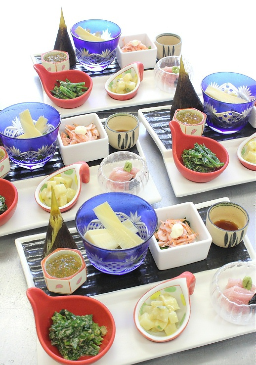 三重県最北端いなべ市の日本料理 昭栄館の料理長のブログです。今日は、多度(桑名市)からご婦人4名様のご予約。お越し頂いたことのあるお客様が、お友達をお連れになってのご来店です。本日の「前菜」です。内容は、・私が掘ってきた桑名の筍 蕗 若布 木の芽ゼリーかけ・駿河湾産 釜揚げ桜海老 いなべのほうれん草浸し 生姜マヨネーズ・いなべの菜花の胡麻和え・桑名の筍の木の芽味噌和え・京都丹後産 天然本まぐろ 大とろ 海苔の酒和え 本山葵 土佐醤油 でした。お客様が、筍の木の芽味噌和えを召し上がると、「美味しい~」ってお声がよく聞こえて参ります。京都から取り寄せる西京味噌にたっぷりの卵とたっぷりのお酒、お砂糖を加え、ゆっくりと練り上げた玉味噌に、自家栽培の木の芽を加えた木の芽味噌。 玉味噌は、吉兆の分量を忠実に・・・。よく鮮やかな緑色の木の芽味噌を見ますが、当店のは、刻んだ山椒の葉がよくわかるリアルな木の芽味噌です。ありがたい平日(本日はご予約4名様)のお客様。(土曜は、80名様 日曜は、86名様のご予約を頂戴しています。) いつもより少しサービスして、お料理しています。今日は、穀雨(こくう)。昨晩からたっぷりの雨をもらいました。庭の木々花々・山椒、筍にいい雨になりました~。「お造里」です。輪島塗の朱盆に盛り合わせています。(私が生まれる前のお盆や器。 新しい器、昭和の器を組み合わせてお料理しています。)内容は、・高知土佐清水産 初鰹 いなべのわさび菜 菊花浸し 卸し生姜 土佐醤油 お塩 どうぞお好みで・・・・富山湾産 釜揚げ蛍烏賊 桑名の筍 いなべの芹 芥子酢味噌 でした。 この時期の鰹(初鰹)、美味しいですね~。平日は、小さめの魚で私もいろいろと楽しんでいます。週末は、やはりたくさんのお客様。まぐろなど、魚体の大きなものが、扱いやすいですね。 (明日は、鳥取から本まぐろが、入荷します。)明日土曜は、ご法事をはじめ、80名様のご予約を頂戴しています。 張り切ってお料理して参りましょう! 料理長