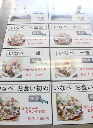 三重県最北端いなべ市の日本料理 昭栄館の料理長のブログです。七五三の時期になりましたね。 ↑ 当店の 「七五三のお祝い膳」 です。七五三のお子様用のお料理 税込み 3,000円です。 特別に おもちゃ 2個 プレゼントです。 お料理の詳しい内容は、コチラをご覧下さいませ。先週末、一組目のご利用がありました。嬉しいですね。地元阿下喜のご家族様でした。先日から、コチラのブログ・私のフェイスブックページ・昭栄館ホームページなど、インターネットで七五三のお祝い膳のご紹介をしていますので、お問い合わせもたくさん頂戴しています。来月中旬にご予約を頂戴したご家族様は7歳の男の子 3歳の男の子 のご兄弟揃って、七五三のお祝いのお席です。おめでたいですね~。 もっともっと、七五三のご利用が増えるように・・・と思って、 ↑ 七五三のお祝い膳のお知らせを先日作成しました。 A4の用紙に印刷して、ラミネートして・・・。こういう作業、結構好きです。お料理はもちろんのこと、パンフレット類も手作りです。 ↑ はがきサイズのお知らせも作成しました。只今 昭栄館店内他、・いなべっこさんのレジ後ろのテーブル・阿下喜温泉さんの切符売り場の前のパンフレットスペースに置かせて頂いています。 どうぞ、皆様お手にお取りください。いなべ市内は、もちろん、東員町 菰野町 桑名市 四日市市 鈴鹿市 岐阜県上石津町 滋賀県東近江市の パパさん ママさん おじいちゃん おばあちゃん、 七五三の大切なお祝いのお席は、 いなべの幸せレストラン 日本料理 昭栄館へ。 料理長