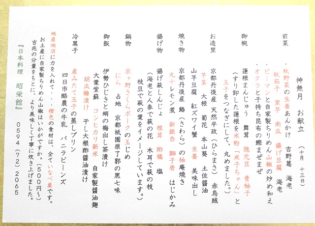 三重県最北端いなべ市の日本料理 昭栄館の料理長のブログです。本日14日日曜のお料理風景を少しご紹介。一歳のお誕生会のご家族様 6名様のお献立です。お祝いのお席は、ピンク色の献立用紙に印刷しています。 祝 の遊印を捺して・・・。 先ほどご紹介しましたが、本日の一歳のお誕生日膳は、コチラ。始めのお料理「前菜」です。お祝いの雰囲気で盛り合わせました。 鯛の器には、一口お赤飯を盛り込んでいます。 色づいた柿の葉や金銀松ぼっくりをあしらって・・・。「お造里」です。長皿にいろんな器で楽しく・・・。 ↑ のど黒の炙り造り・・・とっても脂のっていますよ~。本わさびは、静岡県有東木のわさび農家から採れたて直送。 17代 400年続く 日本最古のわさび農家です。 ↑ 庭で採りたての水引(ミズヒキ)・・・そろそろ終盤です。 ↑ 藤袴(フジバカマ)は、秋の七草の一つですね。 一歳のお誕生日・・・大切なお席に当店のご利用ありがとうございました。今日のお昼は、市内から忌明けのご法事 お二組のご予約も頂戴していました。14名様 45名様のお献立です。たくさんのお客様でも出来立てを一品ずつお運びするお料理スタイルです。皆様がお席にお着きになってから、前菜をお運びします。お食事の進み具合に合わせ、一品ずつお料理を仕上げて参ります。さすがに、仲居も調理場も大忙しです。夜は、桑名からご家族 4名様もご来店頂きました。 本日もたくさんのご来店ありがとうございました。 料理長