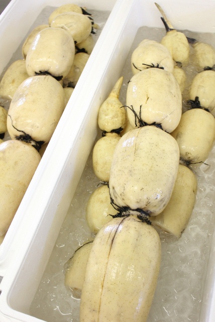 三重県最北端いなべ市の日本料理 昭栄館の料理長のブログです。本日の仕入れ物を一部ご紹介して参りましょう。「のど黒」入荷。本日は、4尾で1キロ。京都丹後半島から獲りたて直送です。とっても脂がのったお魚。皮目を炙ってからお造里にします。夜のお客様に・・・。 ↑ よ~く見てみると、手前から2尾目の口から、何やら出ています。 引っ張ってみましょう。 小アジでした。産地直送のお魚、鮮度がいいのはもちろんのこと、こんな楽しみもありますね。「天然ヒラマサ」入荷。本日は、3尾で4、9キロ。コチラも京都丹後半島より直送。もちろん、お造里に・・・。「連子鯛 レンコダイ」入荷。本日は、4尾。コチラも京都丹後半島より直送。夜のお客様、「赤ちゃんのお食い初め膳」「七五三のお祝い膳」の鯛の姿焼きに・・・。この他、赤いかも京都丹後半島から。地元阿下喜の魚屋さんからは、キハダマグロが入荷しました。「新蓮根」入荷。蓮根農家から掘りたて直送。本日は、8キロ。東京吉兆 京都吉兆も仕入れる逸品です。 蓮根饅頭を仕込みます。「鬼饅頭」を頂きました。近くの和菓子店の若旦那さん(阿下喜のヨン様)から。この辺りでは、「鬼まん」と呼びますね。サツマイモがたっぷり入っていて、美味しかったです。いつもありがとう! 新鮮食材・旬の食べ物に囲まれて・・・美味しい仕事ですよ~。 料理長