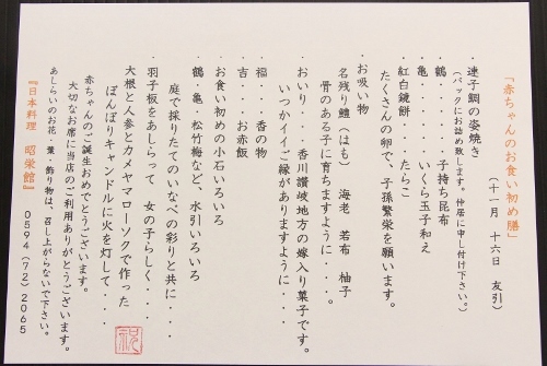三重県最北端いなべ市の日本料理 昭栄館の料理長のブログです。本日は、11月14日 金曜日。(ゴメンナサイ。11月20日に追いかけて書いています。)今夜は、当店大人気の赤ちゃんのお食い初めのご予約を頂戴していました。今年68組目のご家族様の赤ちゃんのお食い初め膳。ご覧頂きましょう。お献立です。ピンク色の献立用紙に 祝 の遊印を捺して・・・。本日の赤ちゃんは、女の子。女の子バージョンの内容・あしらいものでご用意しました。本日の赤ちゃんのお食い初め膳です。(赤ちゃん専用 2,500円税別)おめでたい朱籠に、連子鯛の姿焼きを中心に、子孫繁栄を願うおめでたいお料理を、鶴 亀 福 吉 紅白鏡餅など、おめでたい器に盛り込みました。大根と人参とカメヤマローソクで作ったぼんぼりキャンドルに、火を灯して、雰囲気もアップ。鶴 亀 松竹梅の水引飾りで雅な雰囲気に・・・。昭栄館オリジナルの赤ちゃんのお食い初め膳は、季節感もたっぷり。庭で採りたての千両 大根の葉 山茶花 などあしらいました。 赤ちゃんのご誕生おめでとうございま~す!赤ちゃんのお食い初め・・・大切なお席に当店のご利用ありがとうございました。赤ちゃんのお兄ちゃん(五歳)は、↑ 七五三のお祝い膳のご利用でしたね。今後ともいなべの昭栄館をよろしくお願い申し上げます。当店大人気の赤ちゃんのお食い初め膳のこと、 当店HP内 コチラのページ に詳しく書いています。 ブログ内お食い初め膳のカテゴリからは、 過去のお食い初め膳、ず~っとさかのぼってご覧になれますよ。いなべ市内は、もちろん、東員町 菰野町 桑名市 川越町 朝日町 四日市市 鈴鹿市 近くの岐阜県 近くの愛知県のパパさん ママさん おじいちゃん おばあちゃん大切な赤ちゃんのお食い初めのお席は、是非 いなべの昭栄館へ~。 料理長