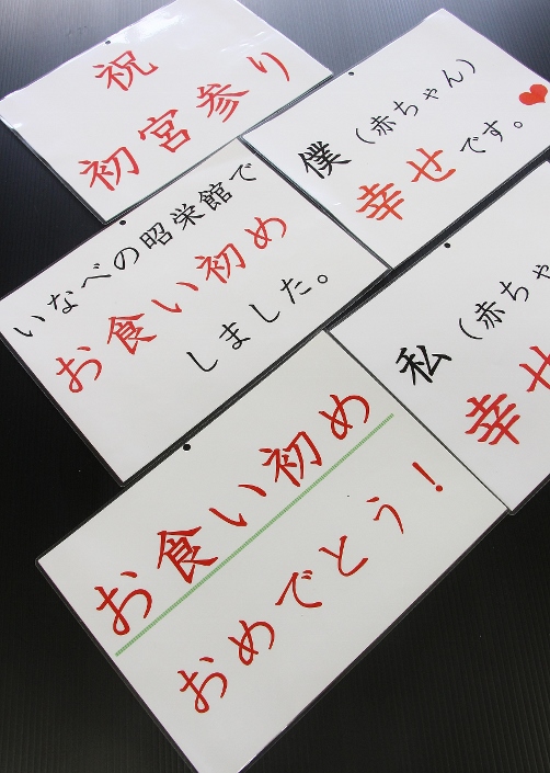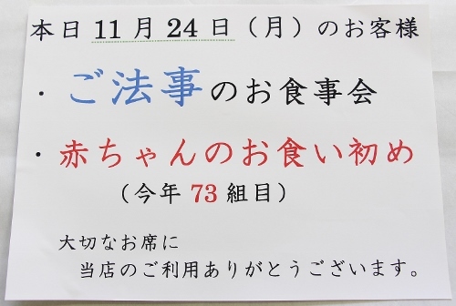 三重県最北端いなべ市の日本料理 昭栄館の料理長 42歳のブログです。本日は、11月9日 日曜日。(遅れてゴメンナサイ。11月13日朝に追いかけて書いています。)当店大人気の赤ちゃんのお食い初めのご利用がございました。本日は、お二組。今年66組 67組目のご家族様になります。当店大人気の赤ちゃんのお食い初め膳(赤ちゃん専用 2,500円)。本日のお料理風景をご覧下さい。お献立です。本日は、お二組とも男の子。男の子バージョンの内容・飾りつけでご用意しました。ピンク色の献立用紙に 祝 の遊印を捺して・・・。先にお越しになった 今年66組目のご家族様の赤ちゃんのお食い初め膳です。おめでたい朱籠に 紅葉鯛(天然真鯛)の姿焼きを中心に盛り付け、おめでたい鶴 亀 福 吉 紅白鏡餅の器に、子孫繁栄を願うおめでたいお料理を盛り込みました。大根と人参とカメヤマローソクで作ったぼんぼりキャンドルに火を灯して、雰囲気もアップ。鶴 亀 松竹梅の水引飾りで 雅な雰囲気に・・・。昭栄館オリジナルの赤ちゃんのお食い初め膳は、季節感もたっぷり。庭で採りたての千両 葉付き着柚子 銀杏 色づいた夏椿の葉 南天の葉 松葉の他、いなべ産の千日紅 をあしらいました。 赤ちゃんのご誕生 おめでとうございま~す!続いてお越しになった今年67組目のご家族様の赤ちゃんのお食い初め膳です。おめでたい朱籠に、紅葉鯛(天然真鯛)の姿焼きを盛り込みました。今日はあいにくの雨でしたが、なかなかイイ写りしているでしょう~。いろいろ工夫して、雨の日でもうまく撮影できるコツをつかみました。男の子のお祝いですので、やっこ凧 メンズ羽子板などあしらっています。鯛の姿焼きも美味しそうでしょう~。お座敷の記念写真用メッセージボードご用意しています。A4サイズでラミネート加工してあります。きっとお食い初めしながら、お写真お撮りになっていることでしょうね。赤ちゃんのお食い初め・・・ 大切なお席に当店のご利用ありがとうございました。私 三児の父の42歳。赤ちゃんの子育ての苦労・喜び、よくわかるつもりです。大きくなったお子様と、いつか私のブログをご覧になることを願って、毎回の赤ちゃんのお食い初め膳、丁寧にご紹介しているつもりです。来週末の金土日は、お食い初め 4組承っています。一気に 68組 69組 70組 71組のご利用になります。当店大人気の赤ちゃんのお食い初め膳のこと、 当店HP内 コチラのページ に詳しく書いています。 ブログ内お食い初め膳のカテゴリからは、 過去のお食い初め膳、ず~っとさかのぼってご覧になれますよ。いなべ市内は、もちろん、東員町 菰野町 桑名市 川越町 朝日町 四日市市 鈴鹿市 近くの岐阜県 近くの愛知県のパパさん ママさん おじいちゃん おばあちゃん大切な赤ちゃんのお食い初めのお席は、是非 いなべの昭栄館へ~。 料理長