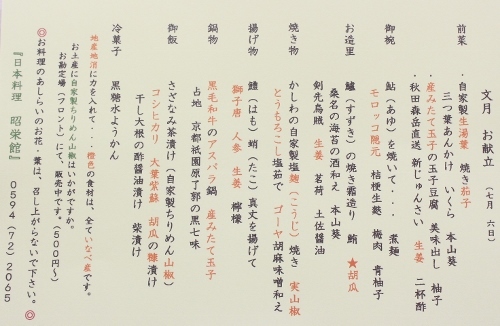 三重県最北端いなべ市の日本料理 昭栄館の料理長のブログです。本日は、7月20日 月曜。海の日ですね。市内から、ご法事のご予約を頂戴していました。21名様。お料理風景をご覧下さい。お献立です。お献立は、お一人様に一枚ずつご用意してます。(A5サイズです。)地元いなべ食材は、色を変えて印刷しています。結構いろいろあるでしょう~。当店のお料理は、コース仕立て。お献立の順番に、一品ずつお運びします。はじめのお料理「前菜」です。本日は、4種盛り。・自家製生湯葉の生うにあんかけ いくら 焼き茄子 ふり柚子・秋田森岳直送 じゅんさい 生姜 二杯酢・産みたて玉子の玉子豆腐 美味出し 黒七味・ハモの卵の塩辛とケンサキイカの和えもの でした。 庭で採りたての朝顔の葉とつぼみをあしらって・・・。「お造里」です。スズキの焼き霜造り まぐろ 大根 より人参 桑名の海苔の酒和え ハート胡瓜 本山葵 土佐醤油ケンサキイカ 生姜 茗荷 庭で採りたての桔梗 京都から取り寄せるミニ団扇をあしらって・・・。ご法事・・・大切なお席に当店のご利用ありがとうございました。 料理長