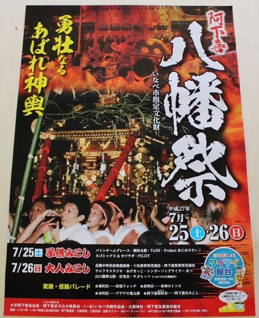 三重県最北端いなべ市の日本料理 昭栄館の料理長のブログです。本日は、7月6日 月曜日。地元阿下喜のお祭り 八幡祭(はちまんまつり)、近づいて来ましたね。阿下喜の皆さんが、大好きな八幡祭。記念写真用メッセージボード、 昨年作ったものを出してきました。お祭り当日まで、店内に掲示しています。是非、記念写真にご利用ください。もう1年も前になってしまいますが、昨年2014年の八幡祭のブログを、先日から少しずつ追いかけて書いています。 八幡祭 子供みこし 2014のブログは、コチラ。夏休みは、いろいろと忙しく、写真の整理・ブログ、後回しになって一年経ってしまいました。せっかく整理出来た写真。パネルにして店内に飾りましょう。楽天写真館から現像に出していた写真が届きました。 ↑ 八幡祭 大人みこし 変装(仮装)パレードの写真です。 大きなA4サイズです。 ブログは、只今追いかけて書いています。 書け次第、リンクしたいと思います。 ↑ 阿下喜女みこしさんの写真です。 八幡祭 2014 阿下喜女みこし ブログは、コチラ。 ↑ 拡大出来ますよ。 ↑ 拡大出来ますよ。早速、パネルに仕上げ、店内に掲示しました。本日夜のお客様は、地元阿下喜の皆様 24名様。 是非、ご覧下さ~い。 料理長