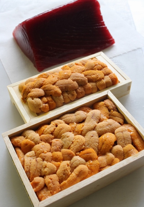 三重県最北端いなべ市のの日本料理 昭栄館の料理長43歳のブログです。30代半ばから、8年と9ヶ月、毎日ブログ書いています。本日は、7月11日 土曜日。仕入れもののご紹介から参りましょう。「鱸 スズキ」入荷。本日は、2キロサイズが3尾。京都は丹後半島網野から獲りたて直送。スズキと言えば、出世魚。地方にもよりますが、セイゴ→フッコ→スズキ。こんな感じに名前が替わります。「剣先烏賊 ケンサキイカ」入荷。本日は、合計6キロほど。コチラも丹後から直送です。袋に入っていて、ご覧になりにくいと思いますので、先日撮影した写真を。大きなもので、60センチくらいあります。獲りたて新鮮なので、身は活きていて、模様が点滅していますよ。「生うに」入荷。この他、まぐろも入荷。地元阿下喜の魚屋さんから仕入れました。続いて、その他の食材紹介。昨日入荷した鱧(ハモ)7本ですが、 ↑ 新鮮な内臓から ↑ ハモの卵の塩辛を仕込みました。 ↑ 本日入荷した剣先烏賊のエンペラと和え、レモン汁を少し。 今宵の晩酌のアテになりました。続いて、頂き物を少し。「砂丘メロン」を頂きました。美味しそうですね。今シーズン初メロン。イイ感じに熟れて来ましたら、頂きたいと思います。グッと気温があがりましたので、熟れるのが早いかも。いつもありがとう!「天然あゆ」をたくさん頂きました。当店スタッフの旦那様が、鮎釣りにお出かけになり、お持ち下さいました。早速、塩焼きに。我が家の本日の夕飯のメインに。「めっちゃ美味しい」って子供たちも一人5尾くらい食べていましたよ。いつもありがとう! 本日の仕入れもの 頂き物のご紹介でした。続いて、本日のお料理風景と参りたいところですが、明日日曜も大忙しで、ブログの書き上げが来週になりそうです。申し訳ありません。本日の七回忌のご法事のお客様の ↑ お料理風景 ↑ 記念写真もバッチリです。双子ちゃんの一歳のお誕生会でご来店の皆様の ↑ お料理風景、 ↑ 記念写真もバッチリです。ブログの書き上げは、週明け月曜~水曜。お写真のお届けは、来週末になりそうです。もうしばらくお待ちくださいね。明日日曜は、三回忌のご法事 28名様をはじめ、ご結納 13名様ご結婚披露宴 28名様喜寿のお祝い 10名様 傘寿のお祝い 7名様 合計 86名様のご予約を頂戴しています。 張り切ってお料理して参りましょう! 料理長