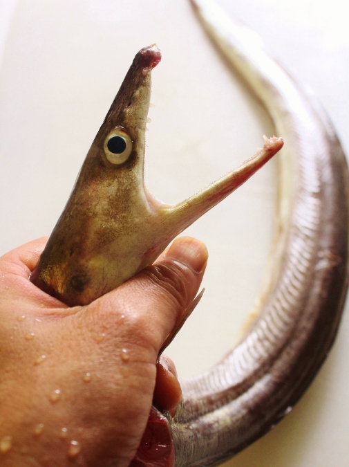 三重県最北端いなべ市の日本料理 昭栄館の料理長のブログです。本日は、7月10日 金曜日。仕入れもののご紹介から参りましょう。「鱧 ハモ」入荷。本日は、600グラムサイズ7本。愛媛県伊予長浜から直送。今シーズン52本目の入荷となりました。鱧椀 鱧寿司などに仕込みました。「生じゅんさい」入荷。本日は、3キロ。秋田県森岳から採りたて直送。今シーズン28キロ目の入荷です。只今、前菜の一品として登場しています。地元いなべ食材の仕入れに いなべっこ へ。仕入れものです。胡瓜 お葱 とうもろこし お豆腐 油揚げ さくらポークは、地元いなべ産。焼き海苔は、桑名産。牛乳とヨーグルトは、四日市酪農の製品です。先程ご紹介した鱧(ハモ)ですが、内臓も新鮮。 ↑ ハモ7本分の内臓です。 左5本分がメス(卵) 右2本分がオス(白子)です。 ↑ 内臓だけでも30センチ以上ありますよ。 (肝 胃袋 浮き袋 苦玉 などです。)新鮮な内臓(肝と胃袋)、まかないで頂きました。フライパンで香ばしく塩焼きにして、いなべ産の一味唐辛子を振りかけました。トロリとする肝、コリコリする胃袋、美味しいですよ~。ハモの肝は、大きいですよ。うなぎの5倍~10倍はありますでしょうか。きっと栄養もたっぷり。これで夏バテ防止です。本日夜のお客様は、女性のお集まり7名様。お献立です。地元いなべ食材は、色を変えて印刷しています。結構いろいろあるでしょう~。 いつもご利用ありがとうございます。 ご来店ありがとうございました。明日土曜日は、 ご法事をはじめ、 双子のお子様の 一歳のお誕生会を承っています。 大切なお席に当店のご利用ありがとうございます。 張り切ってお料理して参りましょう! 料理長