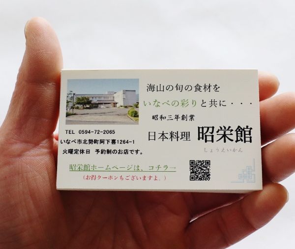 三重県最北端 いなべ市「阿下喜 あげき」の 日本料理 昭栄館 の料理長のブログ。2006年9月13日から12年間毎日更新中です。 ↑ いなべ市ってこんなところ。にぎわいの森で、日本中から注目を集めている町ですよ。 にぎわいの森 いなべヒュッテ って?本日は、2019年 6月18日 火曜定休日。料理長の休日です。週末分の書けなかったブログの書き上げをはじめ、・ホームページの更新・グーグル 昭栄館への投稿・Facebook 昭栄館への投稿・インスタグラム 昭栄館の投稿 など、パソコン仕事に励みました。名刺(ショップカードと言うのかな?)を新しく作り直しました。 ↑ 表面・・・ピンボケでゴメンナサイ。パソコンで自作しています。折り曲げて、パキッと一枚ずつ取り出せるタイプ。 ↑ 裏はこんな感じ。切り離しました。当店の写真も新しくしました。先日、母(昭和21年生まれ)と市内のお店のチラシを見ていましたら、「この字、小さいね。読みにくいわ・・・」って。名刺の文字サイズを少し大きくしてみました。当店HPにつながるQRコードも入れてみましたよ。裏面にもQRコードを2種。・ブログへのQRコード・Facebook 昭栄館へのQRコード楽天ブログ「料理長の日記」13年間毎日更新中と書きましたが、12年間(詳しくは、12年9か月)更新中でした。間違えましたが、このままで参ります。ご愛敬!午後は、お墓参り、山の様子見に・・・。市内に山を持っていますが、手入れが出来ておらず、近隣の方にご迷惑をおかけてしています。申し訳ありません。なんとか山を守っていかないといけませんね。いい方法が見つかるよう、市役所 地元の林業の方 不動産屋さん 森林組合 太陽光発電業者に相談したり、いろいろ工夫しております。夕方は、庭木の剪定に励みました。この時期、お客様が少なめなので、時間があれば庭木の剪定、草取りをしています。少しずつ日焼けしてきました。さあ、また明日から張り切ってお料理して参りましょう! 料理長