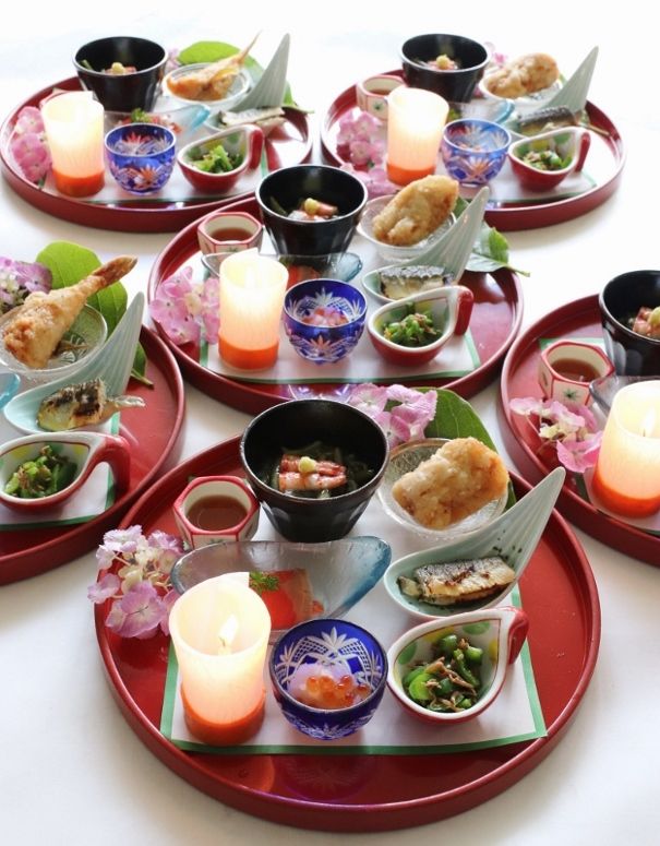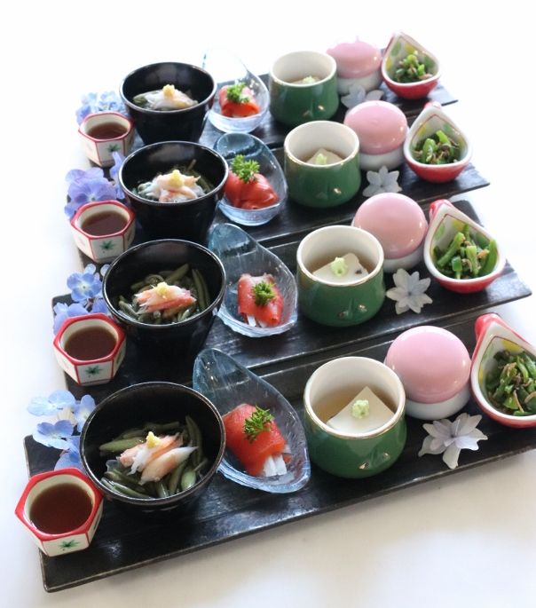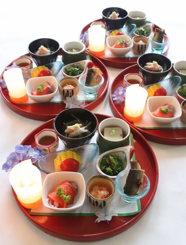 三重県最北端 いなべ市の阿下喜(あげき)にございます 日本料理 昭栄館 の料理長のブログ。2006年9月13日から12年間毎日更新中です。 ↑ いなべ市ってこんなところ。最近、フェアトレードタウン宣言で話題のいなべ市ですよ。当店周辺の地図は、 グーグルマップでご覧下さい。本日は、2019年 6月23日 日曜日。庭の様子からご覧頂きましょう。「半夏生 はんげしょう」です。綺麗に色付いてきました。「桔梗 ききょう」です。コチラは、秋の七草の一つですが、この時期から咲き始めます。「カワラナデシコ」です。コチラも秋の七草。可憐ですね~。「ダルマ萩 はぎ」です。萩は、秋の七草。この他、白萩 江戸絞り 飛鳥野萩 宮城野萩を植えています。本日お昼席は、赤ちゃんのお食い初めがお二組様。ご家族4名様のお献立です。祝 の遊印を捺して・・・。特別会席(7,000円)のご利用でした。はじめのお料理「ぼんぼり八寸」です。輪島塗の朱の丸盆に、おめでだく盛り合わせました。庭で採りたての紫陽花を添えて・・・。 ↑ 赤ちゃんのお食い初め膳(今年31組目)のお料理風景は、 また後ほど詳しくご紹介して参ります。 ↑ 記念写真のご様子も。 大切なお席に当店のご利用ありがとうございました。ご家族5名様のお献立です。お献立は、お一人様に一枚ずつご用意しています。是非、記念にお持ち帰り下さい。 ↑ 赤ちゃんのお食い初め膳(今年32組目)のお料理風景は、 また後ほど詳しくご紹介して参ります。 大切なお席に当店のご利用ありがとうございました。 料理長