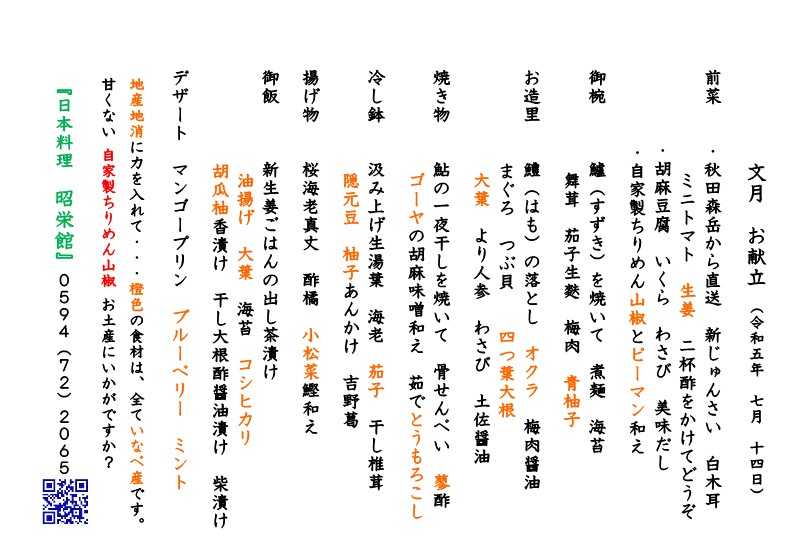 本日は、2023年 7月14日 金曜日。夜席のお献立です。雅会席 5,500円のご注文でした。お仕事場の総会のようなお集まり。先日から、こんなお席が数年ぶりに戻ってきました。嬉しいですね~。 大切なお席に当店のご利用ありがとうございました。Kitchen昭栄館(いなべっこ内お総菜販売)明日のラインナップです。明日も張り切ってお料理して参りましょう!三重県最北端 いなべ市「阿下喜 あげき」の 日本料理 昭栄館 の料理長のブログ。2006年9月13日から16年間毎日更新中です。私 料理長 51歳。もう31~26年前になりますが、有名料亭 神戸吉兆で修行して参りました。当店のこと毎日発信している情報 画像など、昭栄館リットリンクからご覧下さいませ。 ↑ いなべ市ってこんなところ。2020年3月から始めた各種「テイクアウトお料理」。当店ホームページ内「テイクアウトのページ」にまとめています。いろいろございます。是非ご覧下さい。 こんな気持ちで、日々お料理しています。 料理長