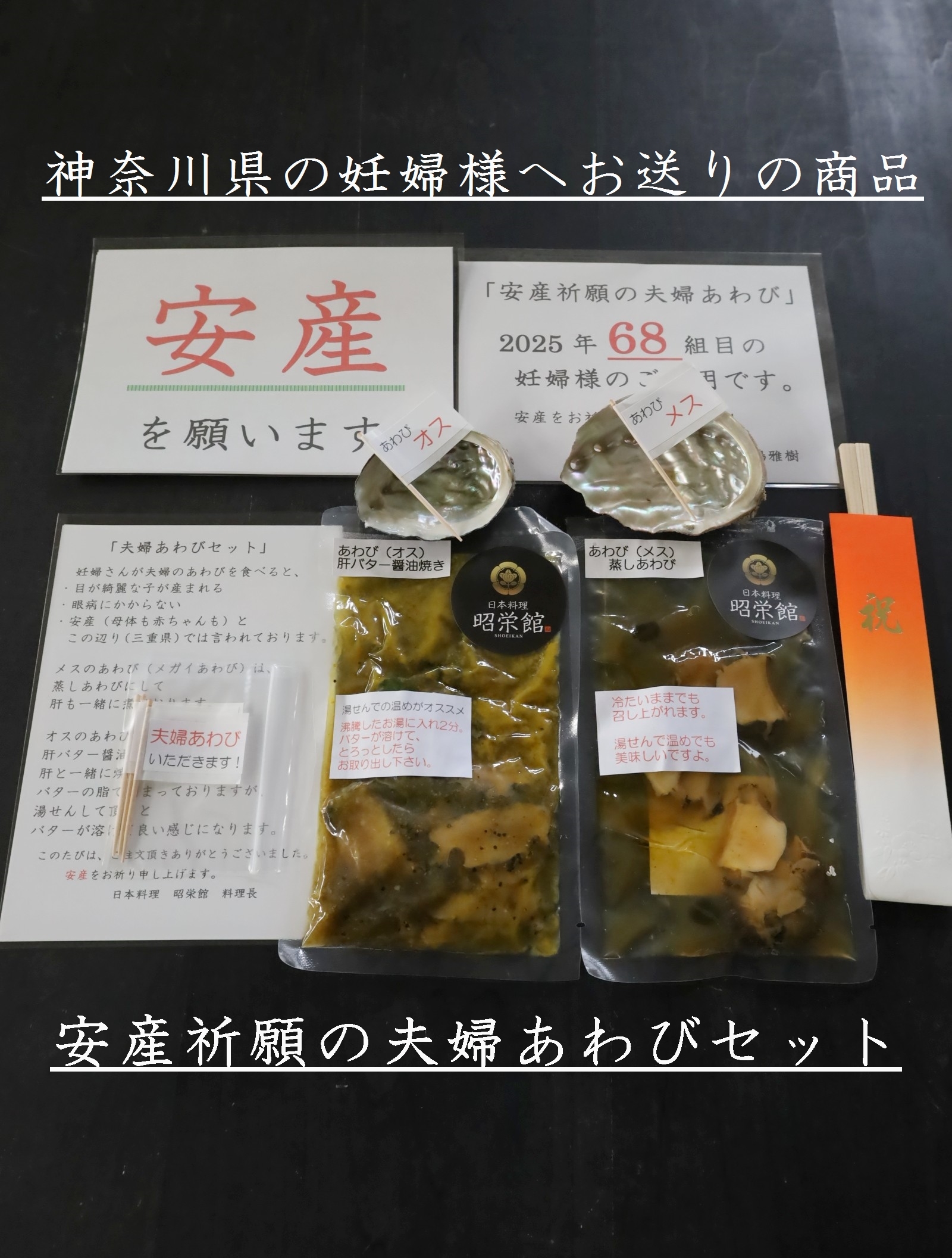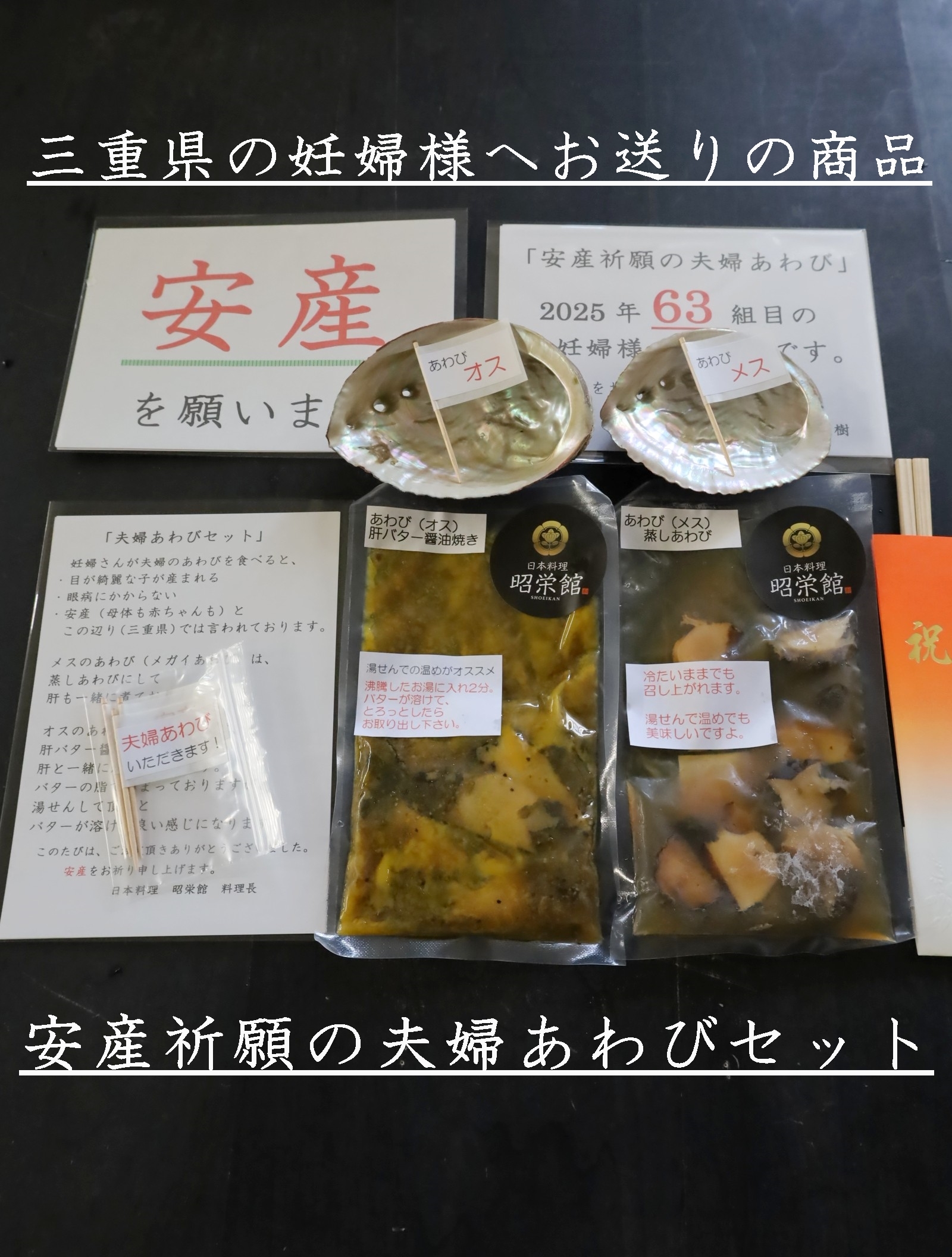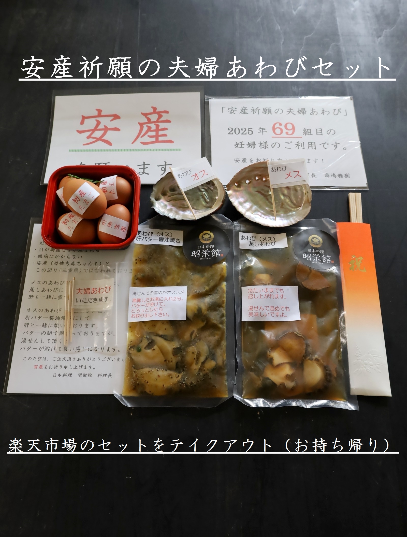 三重県最北端 いなべ市「阿下喜 あげき」の 日本料理 昭栄館 の料理長のブログ。2006年9月13日から18年間毎日更新中です。私 料理長 53歳。もう33~28年前になりますが、有名料亭 神戸吉兆で修行して参りました。当店のこと毎日発信している情報 画像など、昭栄館リットリンクからご覧下さいませ。 ↑ いなべ市ってこんなところ。2022年4月より、楽天市場 日本料理 昭栄館にて、いろいろ販売しております。全国各地にお送りしていますよ~。楽天市場 日本料理 昭栄館 是非、一度ご覧下さいませ。本日は、2025年 4月6日 日曜 大安。「楽天市場 日本料理 昭栄館」に1,221 1,222 1,223 1,224回目 のご注文!遠く 神奈川県の妊婦様へお送りの商品は・安産祈願の夫婦あわびセット 神奈川の皆様 いらっしゃいませ~。続いてお隣 愛知県の妊婦様へお送りの商品も・安産祈願の夫婦あわびセット 愛知の皆様 いらっしゃいませ~。コチラ三重県では、古くから「妊娠中にあわびと食べると、 目の綺麗な子が生まれる 眼病にかからない」と言い伝えられています。当店は、安産祈願の夫婦あわび料理で大人気のお店です。・店内での「安産祈願の夫婦あわび料理」・テイクアウトで「楽天市場の安産祈願の夫婦あわびセット」 共に、たくさんのご利用がございますよ。妊婦さんへの一番のプレゼントとして、大人気です!昨年2024年は、過去最高 213組の妊婦様にご利用頂きました。2025年早くも 64 65組目の妊婦様のご利用です。「写真撮るの忘れて食べちゃった。」「産まれてきた赤ちゃんに、安産祈願のあわび料理を見せてあげたかった。」ご安心ください!!いつか、大きく成長されたお子様に、この安産祈願の夫婦あわび料理を食べて、あなたが産まれたのよとお伝え出来ますように、毎回のあわび料理をアップしております。是非、いつか私のブログにアクセスしていただき、ご家族揃って、お楽しみくださいませ!!!当店の安産祈願の夫婦あわび料理を召し上がって、初節句のお祝い 赤ちゃんのお食い初めで再度ご来店いただくお客様もたくさんございます!楽天アワビランキング 1位を獲得したこと 53回あります!2023年は、6回。8月6日分 9月20日 10月5日分 10月9日分 11月15日分 11月18日分 2024年は、32回!1月14日分 1月15日分 1月16日分(3日連続!)1月28日分 1月29日分 1月31日分 2月1日分 2月13日分 2月16日分 3月4日分 3月17日分 3月19日分 5月21日分 6月8日分 6月9日分 6月18日分 6月29日分 7月2日分 7月21日分 8月1日分 8月17日分 8月26日分 8月27日分 8月31日分 9月12日分 9月29日分 9月30日分 10月4日分 10月6日分 10月10日分 10月17日分 10月29日分2025年は、早くも15回!1月7日分 1月8日分 1月12日分 1月23日分 1月24日分 1月25日分 3日連続!1月28日分 1月30日分3月2日分 3月4日分 3月5日分 2日連続!3月25日分 3月26日分 2日連続!!!3月30日分↑ 2025年 4月3日 デイリーランキング部門にて今年2025年の「戌の日カレンダー」です。今度の「戌の日」は、4月11日 金曜日!!!4月は、戌の日が2回ありますよ!!!楽天市場 お買い物マラソン開催中!!! 全国の皆様 是非ご注文ください!こちらの不手際により「真空袋が閉じられてなくて、汁が漏れていた!」「あわびの殻で袋が破れていた!」様々なご意見を頂戴しまして、梱包の仕方など、日々改善・工夫しております。 どうぞ 安心してお求めくださいませ!!!昨年末から「冷凍」もお選びいただけるようになりました。冷蔵(1週間)冷凍(2週間)と 消費期限が長くなりますので、お日柄(戌の日)の都合 お仕事の都合に合わてご注文いただきやすくなったと思います。昨年末からテイクアウト「楽天市場の安産祈願の夫婦あわびセット」 ↑ 始めていますよ!こだわって、国産の夫婦あわびを使用していますのでイイお値段になります。オスの黒あわびは、愛媛県産 メスのメガイあわびは、山口県産を使用しました。↑ 恒例の メッセージ旗 もお付けしましたよ!楽天レビュー インスタグラムなどでご利用頂けると嬉しいです。続いて、遠く 群馬県の赤ちゃんへお送りの商品は、おうちでお食い初めセット 群馬の皆様 いらっしゃいませ~。幸せレストラン 昭栄館私 料理長が心を込めてお料理しています。お食い初めセット・・・赤ちゃんは食べないし・・・記憶も無いし・・・どうしよう・・・ 赤ちゃんのご成長を願ったお祝い料理縁起の良い小物 お食い初めの小石 たち・・・ 赤ちゃんへの一番のプレゼントになることでしょう!当店は、赤ちゃんのお食い初めでも大人気のお店。・店内での「赤ちゃんのお食い初め膳」・テイクアウトの「おうちでお食い初めセット」 共に、たくさんのご利用がございます。昨年2024年は ↑ 203組の赤ちゃんにご利用いただきました。2025年40組目の赤ちゃんのご利用です!!!今年もたくさんご利用いただけますよう張り切ってお料理して参ります! ↑ お食い初め儀式の流れ 2025年バージョン もお入れしています。 ↑ 恒例の メッセージ旗 もお付けしましたよ! 楽天レビュー インスタグラムなどでご利用頂けると嬉しいです。私 三児(この春 大学4年 大学1