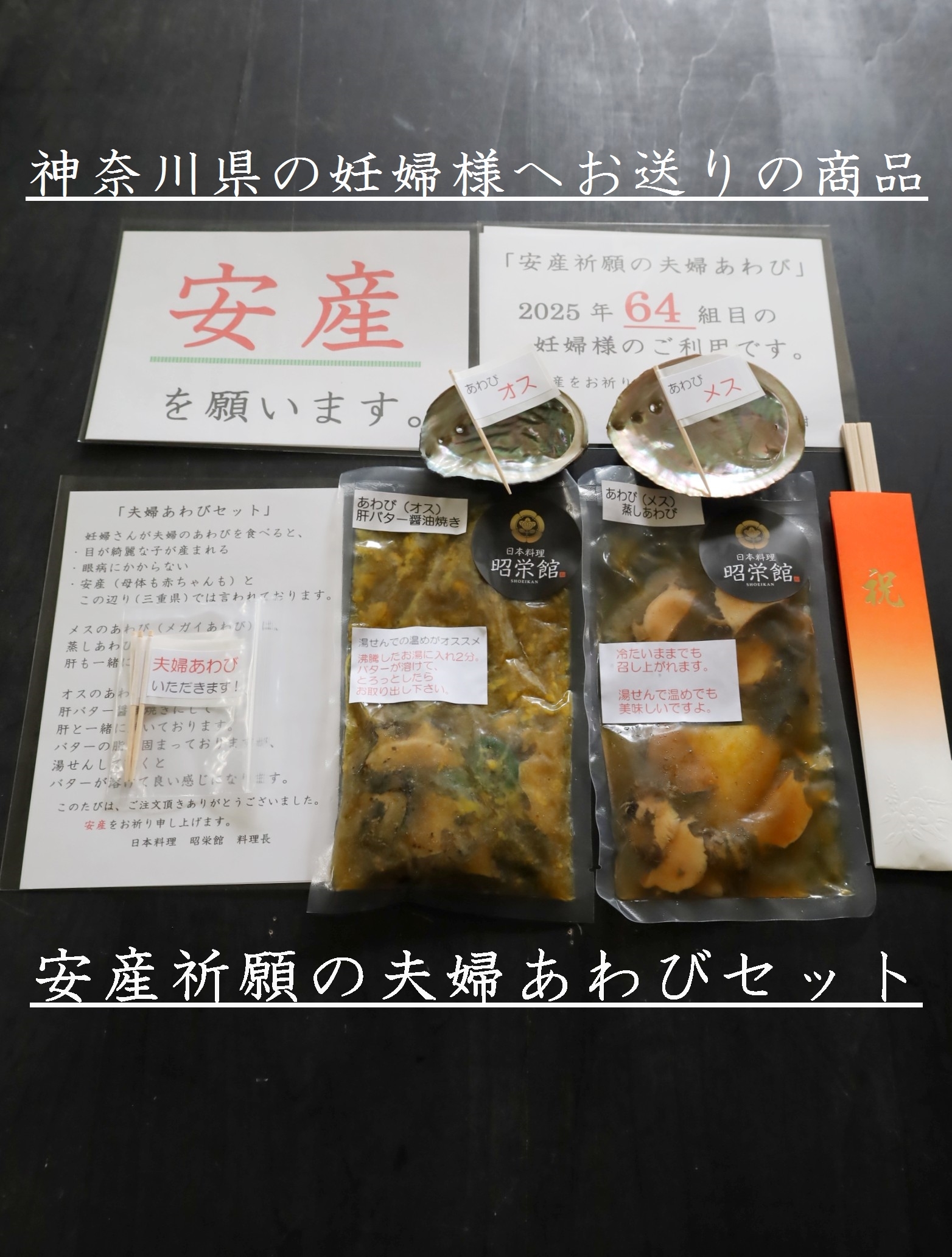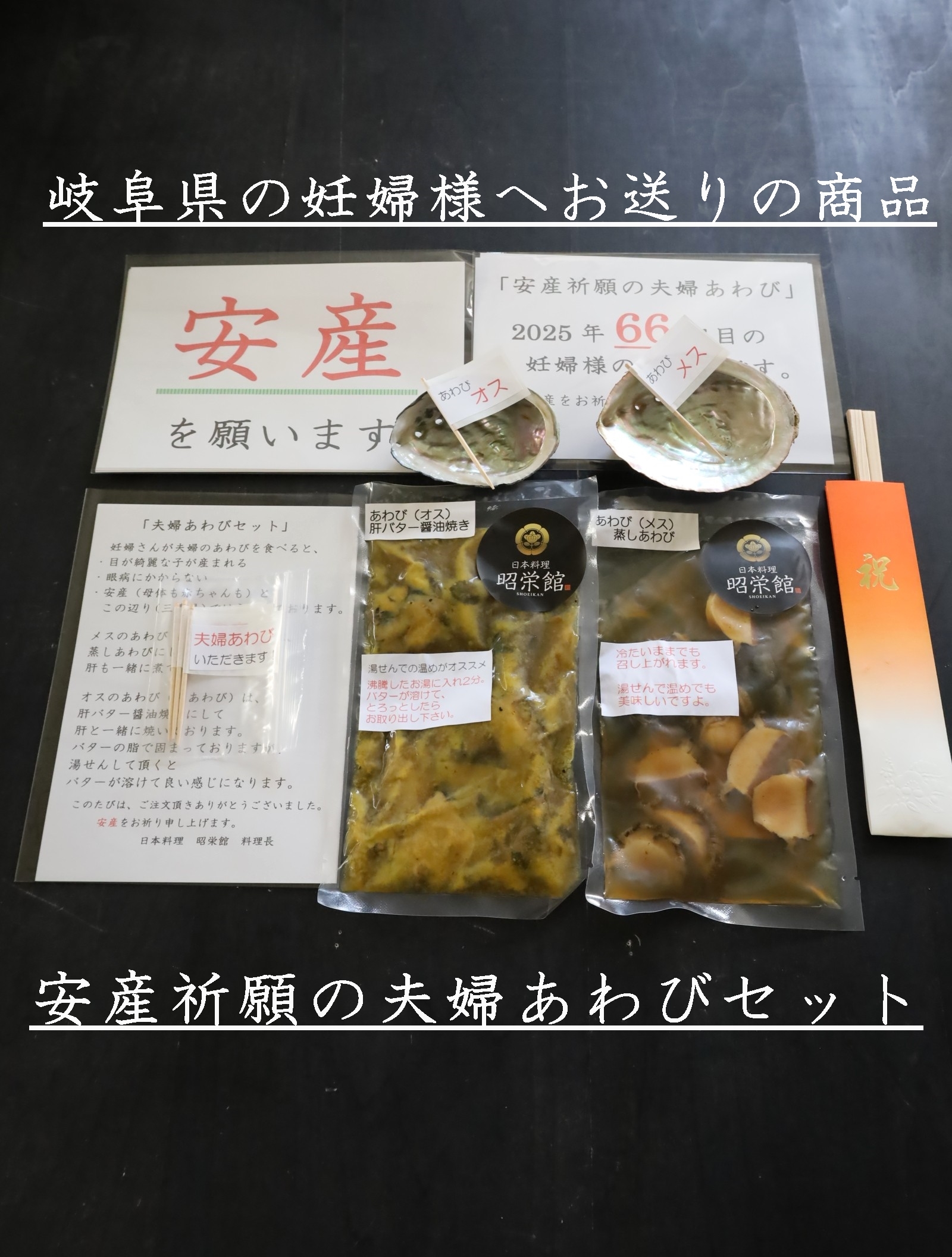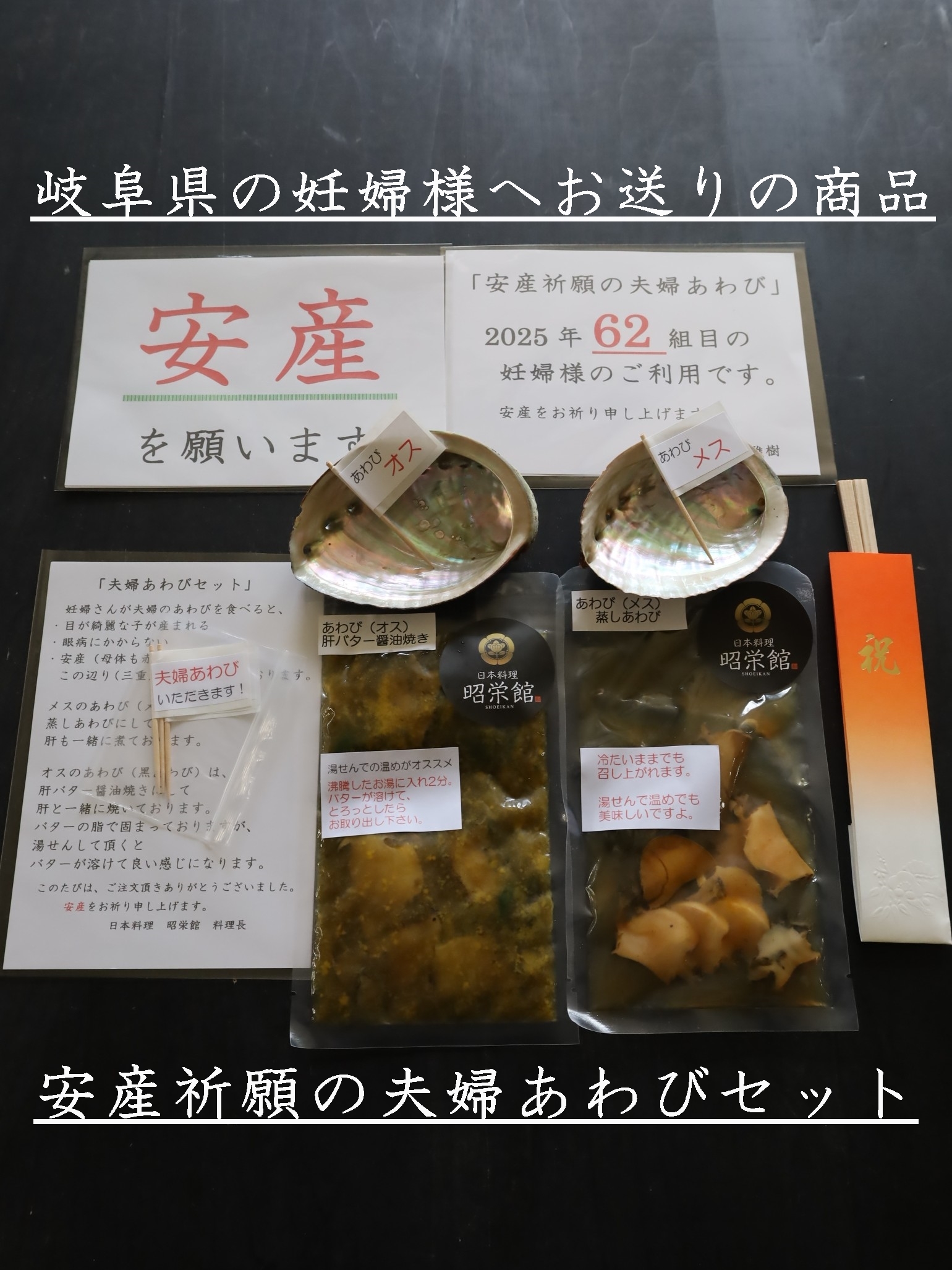 三重県最北端 いなべ市「阿下喜 あげき」の 日本料理 昭栄館 の料理長のブログ。2006年9月13日から18年間毎日更新中です。私 料理長 53歳。もう33~28年前になりますが、有名料亭 神戸吉兆で修行して参りました。当店のこと毎日発信している情報 画像など、昭栄館リットリンクからご覧下さいませ。 ↑ いなべ市ってこんなところ。2022年4月より、楽天市場 日本料理 昭栄館にて、いろいろ販売しております。全国各地にお送りしていますよ~。楽天市場 日本料理 昭栄館 是非、一度ご覧下さいませ。本日は、2025年 4月6日 日曜 大安。「楽天市場 日本料理 昭栄館」に1,221 1,222 1,223 1,224回目 のご注文!遠く 神奈川県の妊婦様へお送りの商品は・安産祈願の夫婦あわびセット 神奈川の皆様 いらっしゃいませ~。続いてお隣 愛知県の妊婦様へお送りの商品も・安産祈願の夫婦あわびセット 愛知の皆様 いらっしゃいませ~。コチラ三重県では、古くから「妊娠中にあわびと食べると、 目の綺麗な子が生まれる 眼病にかからない」と言い伝えられています。当店は、安産祈願の夫婦あわび料理で大人気のお店です。・店内での「安産祈願の夫婦あわび料理」・テイクアウトで「楽天市場の安産祈願の夫婦あわびセット」 共に、たくさんのご利用がございますよ。妊婦さんへの一番のプレゼントとして、大人気です!昨年2024年は、過去最高 213組の妊婦様にご利用頂きました。2025年早くも 64 65組目の妊婦様のご利用です。「写真撮るの忘れて食べちゃった。」「産まれてきた赤ちゃんに、安産祈願のあわび料理を見せてあげたかった。」ご安心ください!!いつか、大きく成長されたお子様に、この安産祈願の夫婦あわび料理を食べて、あなたが産まれたのよとお伝え出来ますように、毎回のあわび料理をアップしております。是非、いつか私のブログにアクセスしていただき、ご家族揃って、お楽しみくださいませ!!!当店の安産祈願の夫婦あわび料理を召し上がって、初節句のお祝い 赤ちゃんのお食い初めで再度ご来店いただくお客様もたくさんございます!楽天アワビランキング 1位を獲得したこと 53回あります!2023年は、6回。8月6日分 9月20日 10月5日分 10月9日分 11月15日分 11月18日分 2024年は、32回!1月14日分 1月15日分 1月16日分(3日連続!)1月28日分 1月29日分 1月31日分 2月1日分 2月13日分 2月16日分 3月4日分 3月17日分 3月19日分 5月21日分 6月8日分 6月9日分 6月18日分 6月29日分 7月2日分 7月21日分 8月1日分 8月17日分 8月26日分 8月27日分 8月31日分 9月12日分 9月29日分 9月30日分 10月4日分 10月6日分 10月10日分 10月17日分 10月29日分2025年は、早くも15回!1月7日分 1月8日分 1月12日分 1月23日分 1月24日分 1月25日分 3日連続!1月28日分 1月30日分3月2日分 3月4日分 3月5日分 2日連続!3月25日分 3月26日分 2日連続!!!3月30日分↑ 2025年 4月3日 デイリーランキング部門にて今年2025年の「戌の日カレンダー」です。今度の「戌の日」は、4月11日 金曜日!!!4月は、戌の日が2回ありますよ!!!楽天市場 お買い物マラソン開催中!!! 全国の皆様 是非ご注文ください!こちらの不手際により「真空袋が閉じられてなくて、汁が漏れていた!」「あわびの殻で袋が破れていた!」様々なご意見を頂戴しまして、梱包の仕方など、日々改善・工夫しております。 どうぞ 安心してお求めくださいませ!!!昨年末から「冷凍」もお選びいただけるようになりました。冷蔵(1週間)冷凍(2週間)と 消費期限が長くなりますので、お日柄(戌の日)の都合 お仕事の都合に合わてご注文いただきやすくなったと思います。昨年末からテイクアウト「楽天市場の安産祈願の夫婦あわびセット」 ↑ 始めていますよ!こだわって、国産の夫婦あわびを使用していますのでイイお値段になります。オスの黒あわびは、愛媛県産 メスのメガイあわびは、山口県産を使用しました。↑ 恒例の メッセージ旗 もお付けしましたよ!楽天レビュー インスタグラムなどでご利用頂けると嬉しいです。続いて、遠く 群馬県の赤ちゃんへお送りの商品は、おうちでお食い初めセット 群馬の皆様 いらっしゃいませ~。幸せレストラン 昭栄館私 料理長が心を込めてお料理しています。お食い初めセット・・・赤ちゃんは食べないし・・・記憶も無いし・・・どうしよう・・・ 赤ちゃんのご成長を願ったお祝い料理縁起の良い小物 お食い初めの小石 たち・・・ 赤ちゃんへの一番のプレゼントになることでしょう!当店は、赤ちゃんのお食い初めでも大人気のお店。・店内での「赤ちゃんのお食い初め膳」・テイクアウトの「おうちでお食い初めセット」 共に、たくさんのご利用がございます。昨年2024年は ↑ 203組の赤ちゃんにご利用いただきました。2025年40組目の赤ちゃんのご利用です!!!今年もたくさんご利用いただけますよう張り切ってお料理して参ります! ↑ お食い初め儀式の流れ 2025年バージョン もお入れしています。 ↑ 恒例の メッセージ旗 もお付けしましたよ! 楽天レビュー インスタグラムなどでご利用頂けると嬉しいです。私 三児(この春 大学4年 大学1