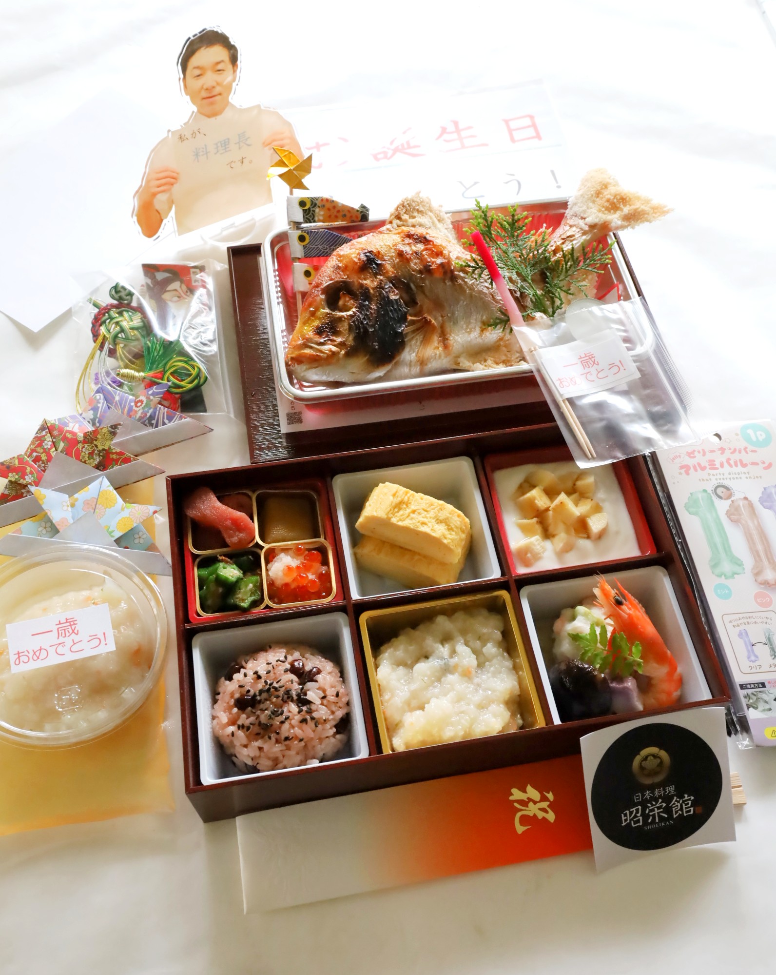 本日は、2025年 4月20日 日曜日。「おうちで一歳のお誕生日セット」(6,000円税込み)のご注文を承っていました。「おうちで一歳のお誕生日セット」。6,000円(税込み)。当店大人気の「一歳のお誕生日お祝い膳」をお持ち帰り仕立て(テイクアウト)に仕立てた感じです。大人気の「一歳のお誕生日お祝い膳」って?2013年 23組2014年 28組2015年 25組2016年 35組2017年 25組2018年 27組2019年 24組2020年 22組2021年 13組2022年 22組2023年 24組2024年 7様にご利用頂いた 大人気の一歳のお誕生日お祝い膳。 一歳のお誕生日お祝い膳のお料理風景は、コチラからご覧ください。あらためまして、本日のテイクアウトお料理「おうちで一歳のお誕生日セット」。詳しくご紹介して参りましょう。お献立です。お料理の詳しい説明書きになっています。昭栄館オリジナルの内容です。本日のお子様は、男の子。男の子バージョン盛りでご用意しました。お献立の最後に、何組目と書いてございます。「うちの〇〇ちゃん、何組目かな~?」って楽しみにお越しください。 今年6組目の一歳お誕生日のお子様のご利用でした。「おうちで一歳のお誕生日セット」です。しっかりした紙製の折箱に、・祝い肴 4種 ・日本料理屋の出し巻き玉子(離乳食)・四日市酪農のヨーグルト バナナ(離乳食)・自家製お赤飯 ・お魚とお野菜の雑炊仕立て(離乳食)・お吸い物の具材 を盛り込んでいます。連子鯛の姿焼きは、別盛りのパックに。お吸い物のお出しは、別盛りの密封袋にご用意しています。 鶴 亀 松竹梅の水引飾り 羽子板を添えました。本日のお子様は、男の子。男の子バージョン盛りです。この時期の男の子ですので、兜の折り紙 鯉のぼりピック を添えました。鯛の姿焼きは、400グラムアップの連子鯛を格好良く串を打ちまして、丁寧に焼き上げております。お召し上がりの際に、レンジでチンされますと、ふんわりとして、より美味しいですよ。 お祝い用のキャンドルも盛り込みました。1の数字バルーンもお付けしています。付属のストローで膨らませて、お楽しみください。(30センチくらいになります)折箱の中身をご紹介。左上は、祝い肴・・・たらこ 数の子 オクラの鰹和え いくらみぞれ和え たくさんの卵 種で子孫繁栄を願います。真ん中上は、日本料理屋の出し巻き玉子。(離乳食)いなべ産の産みたて玉子を使用しています。右上は、四日市酪農のヨーグルト と バナナ。(離乳食)左下は、自家製お赤飯。真ん中下は、お魚とお野菜の雑炊仕立て。(離乳食) 昆布と鰹節のお出し 醤油 塩で味付けしています。右下は、お吸い物の具です。 今回は、ほたて真丈 海老 干し椎茸 菖蒲生麩 自家栽培の山椒の木の芽を盛り込みました。お吸い物のお出しは、別盛りの密封袋にご用意しています。温めて召し上がり下さい。お魚とお野菜の雑炊仕立て・・・サワラ とらふぐいなべの大根 いなべの人参 いなべの生姜 いなべのお葱 いなべのミルキークイーン鰹と昆布のお出し 醤油 お塩で味付けして炊き上げております。私、53歳。三児(大学4年 大学1年 高校2年)の父のオッサン料理長。子供たちが小さい頃は、毎日離乳食を作っていました。離乳食の加減、だいたいわかるつもりです。雑炊ですが、多めに炊き上げますので、残りはパックに詰めています。本日は、2パックになりました。冷凍保存したりして、召し上がり下さい。自作の「一歳おめでとう」シールを貼っています。冷凍庫を開けるたび、幸せ気分!昭栄館オリジナルのサービス・・・記念写真用メッセージカードをお付けしました。(それぞれA5サイズです。)1の数字バルーンと共に、生まれて初めてのお誕生会 一歳のお誕生会の記念写真に、是非ご利用下さいね。 一歳のお誕生日 おめでとうございま~す!「おうちで一歳のお誕生日セット」いかがでしたでしょうか?6,000円(税込み)になります。 3日くらい前までにはご注文下さいませ。 大切なお席に当店のお料理のご注文ありがとうございました。毎回の「おうちで一歳のお誕生日セット」のお料理風景を 「おうちで一歳のお誕生日セット カテゴリ」にまとめて参ります。 今後ともいなべの昭栄館をよろしくお願い申し上げます。いなべの パパさん ママさん 東員町 菰野町 桑名市 四日市市 川越町 朝日町 木曽岬町 鈴鹿市 亀山市 滋賀県東近江市 岐阜県上石津町 名古屋の パパさん ママさん おじいちゃん おばあちゃん ご自宅での一歳のお誕生会の際は、 是非、いなべの昭栄館にご注文下さ~い。三重県最北端 いなべ市「阿下喜 あげき」の 日本料理 昭栄館 の料理長のブログ。2006年9月13日から18年間毎日更新中です。私 料理長 53歳。もう33~28年前になりますが、有名料亭で修行して参りました。当店のこと毎日発信している情報 画像など、昭栄館リットリンクからご覧下さいませ。 ↑ いなべ市ってこんなところ。2020年3月から始めた各種「テイクアウトお料理」。(↑ 2025年 4月1日からのラインナップです)ラインナップ 価格は、ブログを書いた当時のものです。最新のライ