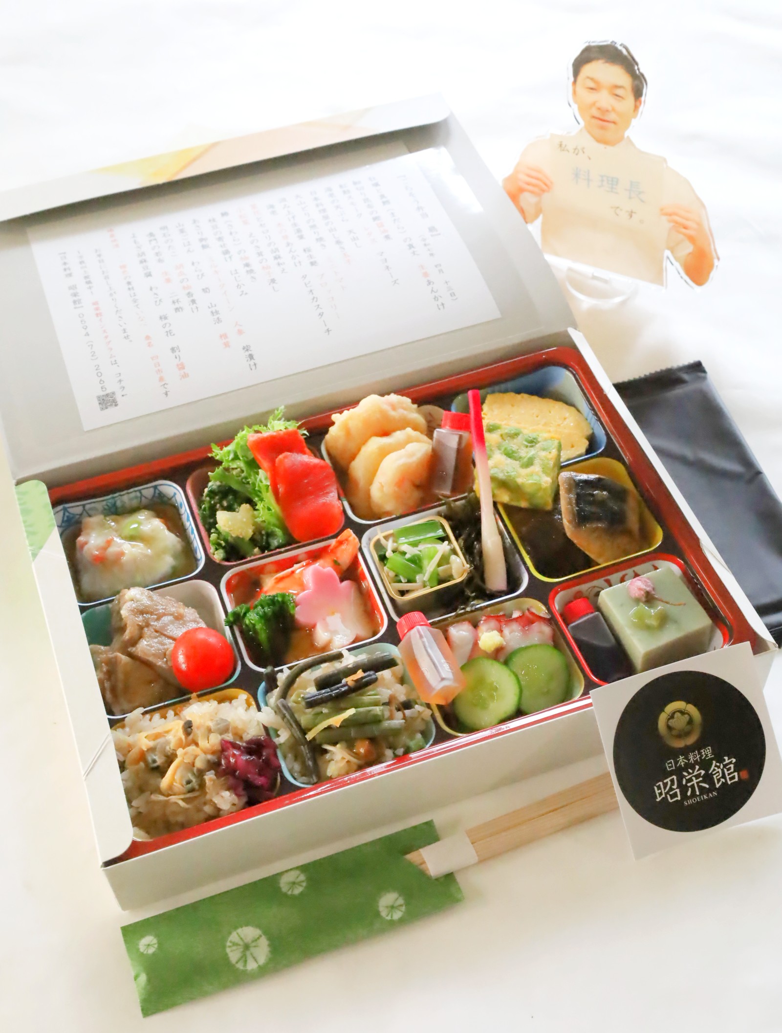↑ ChatGPTで作成したイメージ写真です。本日は、2025年 4月29日 火曜 昭和の日。「ごちそう弁当 華 はな 4,500円」を2膳承っていました。 (こちらのお料理 2膳から承ります。)2020年3月から始めたテイクアウトの『ごちそう弁当』。扇 華 雅 合わせて、本日で11,232膳目のご利用になります。テイクアウトお料理、いなべ市内 東員町 菰野町の皆様、合計金額40,000円以上のご注文で配達させて頂きます。合計金額が満たない場合は、配達料(1,000円~2,000円)を頂戴し、お届けすることも出来ます。それ以外の地域のお客様もお気軽にお問い合わせ下さい。 0594-72-2065 日本料理 昭栄館「ごちそう弁当 雅 5,500円」7膳と共に北勢町 其原地区へお届けに上がりましたよ。昭栄館LINE公式アカウントからの ご予約 お問い合わせは、24時間 365日承ります。 AIによる自動応答(ヘンテコな応答かも)ですが、 24時間以内に 私 料理長からお返事差し上げますので、 しばらくお待ちくださいませ。 昭栄館LINE公式アカウント お友だち登録お待ち申し上げます。 (お急ぎの場合は、お電話ください)それでは、本日の「ごちそう弁当 華 はな」のお料理風景をご覧頂きましょう。12の仕切りにお料理を盛り込んでいます。見た目が賑やかなので、にぎやか盛りとしています。蓋の部分に、お献立をお入れしています。お献立をご覧になりながら、お食事をお楽しみ下さい。お造里を別盛りにしています。保冷剤と共にご用意しますよ。お献立です。一膳に一枚、お献立をお付けしています。説明書きがあると、親切ですよね~。橙色で印刷してあるのが、いなべ 桑名 四日市食材。地産地消 国消国産に力を入れて・・・。季節感を感じられるお料理を丁寧に盛り込んでおります。上質な紙おしぼり 和歌山県産の杉箸もお付けしていますよ。本日は、あさり御飯 山菜ごはんを盛り込みました。 地元いなべ産のお米 ミルキークイーンを使用しています。 どれから食べようか迷いますね~。別盛りにしている「お造里」です。本日のお造里は、紀伊長島産 さわらの炙り 明石のたこ 北海道産ホタテの湯霜 烏賊紫蘇巻き いなべの絹さや わさび 土佐醤油 蛍烏賊の沖漬け 自家栽培の柚子 でした。本日の「ごちそう弁当 華 はな 4,500円」いかがでしたでしょうか?ご家族でのご法事ご家族のお祝い事をご自宅でなさりたいお客様、従業員さんの慰労 退職祝い 歓送迎会に注文しようおうちで美味しいものを食べよう自治会の懇親会で利用しようってお考えの皆様是非、昭栄館のごちそう弁当をご注文下さい。 大切なお席に当店のお料理のご注文ありがとうございました!日本料理屋の本気のテイクアウト「ごちそう弁当 華 はな」のこと、お料理風景は、 「ごちそう弁当 華 カテゴリ」にまとめております。ご覧ください。三重県最北端 いなべ市「阿下喜 あげき」の 日本料理 昭栄館 の料理長のブログ。2006年9月13日から18年間毎日更新中です。私 料理長 53歳。もう33~28年前になりますが、有名料亭で修行して参りました。当店のこと毎日発信している情報 画像など、昭栄館リットリンクからご覧下さいませ。 ↑ いなべ市ってこんなところ。2020年3月から始めた各種「テイクアウトお料理」。(↑ 2025年 4月1日からのラインナップです)ラインナップ 価格は、ブログを書いた当時のものです。最新のラインナップ 価格など ↓当店ホームページ内「テイクアウトのページ」にまとめています。いろいろございます。是非ご覧下さい。今後とも いなべの昭栄館をよろしくお願い申し上げます。 こんな気持ちで、日々お料理しています。 料理長 森嶋雅樹