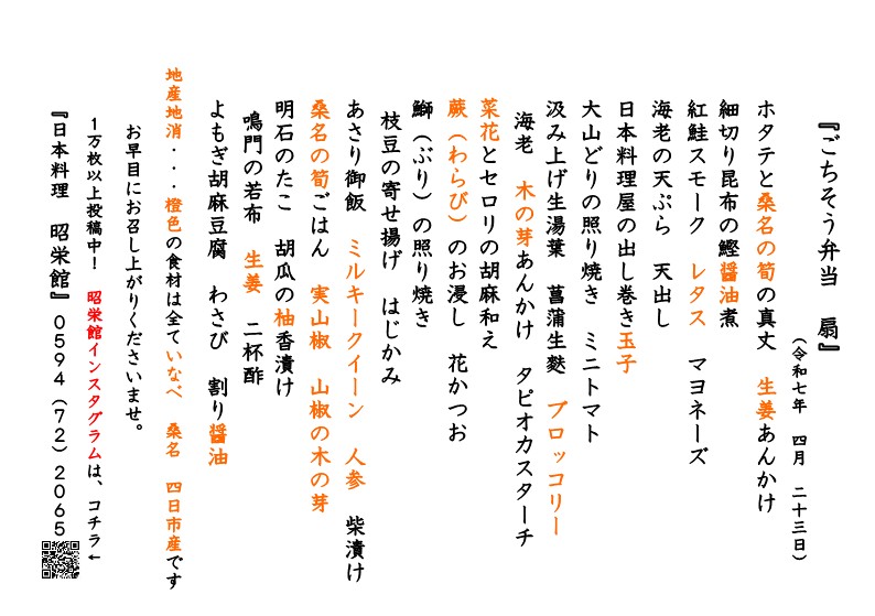 本日は、2025年 4月27日 日曜 友引。テイクアウトお料理のご予約を承っていました。大忙しで駆け足になりますが、本日の昭栄館の様子をご覧ください。「ごちそう弁当 扇 3,500円」のお献立です。9膳承っていました。橙色で印刷してあるのが、いなべ 桑名 四日市食材。地産地消 国消国産に力を入れて・・・。 ↑ 本日の盛り込みの様子です。「お子様弁当 扇 豪華版 3,500円」のお献立です。1膳承っていました。 ↑ 本日の盛り込みの様子です。 ↑ おうちで初節句のお祝いセットのお料理風景は、コチラ。 大切なお席に当店のお料理のご注文ありがとうございました!続いてご来店のお客様。ご法事 12名様は、30畳の扇の間にご用意しました。当店全て足元の楽なテーブル椅子席の個室です。ご安心くださいませ。お献立です。雅会席 5,500円のご注文でした。橙色で印刷してあるのが、いなべ 桑名 四日市食材。地産地消 国消国産に力を入れて・・・。お献立の一番最後のところに、本日のラッキー!がございます。QRコードから、昭栄館公式インスタグラムをご覧ください。本日のラッキーをアップしていますよ。 ↑ 本日のラッキー!は、コチラでした。本日は、お子様3名様。普段 おもちゃ 3人で 3個のところ、9個お持ち帰りいただきましたよ! 大切なお席に当店のご利用ありがとうございました!三重県最北端 いなべ市「阿下喜 あげき」の 日本料理 昭栄館 の料理長のブログ。2006年9月14日から18年間毎日更新中です。私 料理長 53歳。もう33~28年前になりますが、有名料亭 神戸吉兆で修行して参りました。当店のこと毎日発信している情報 画像など、昭栄館リットリンクからご覧下さいませ。 ↑ いなべ市ってこんなところ。先日 令和7年3月29日(土曜)15時に、いなべインターチェンジが開通。高速降りて、当店までお車で3分くらいになりました!!!当店のご予約は、 お電話 0594-72-2065 日本料理 昭栄館又は、昭栄館LINE公式アカウントから 24時間 365日承ります。 AIによる自動応答(ヘンテコな応答かも)ですが、 24時間以内に 私 料理長からお返事差し上げますので、 しばらくお待ちくださいませ。 昭栄館LINE公式アカウント お友だち登録お待ち申し上げます。 (お急ぎの場合は、お電話ください)お撮りしたお写真の画像データをLINEからお送りすることが出来ますので、とても喜ばれております。今後とも いなべの昭栄館をよろしくお願い申し上げます。 こんな気持ちで、日々お料理しています。 料理長 森嶋雅樹