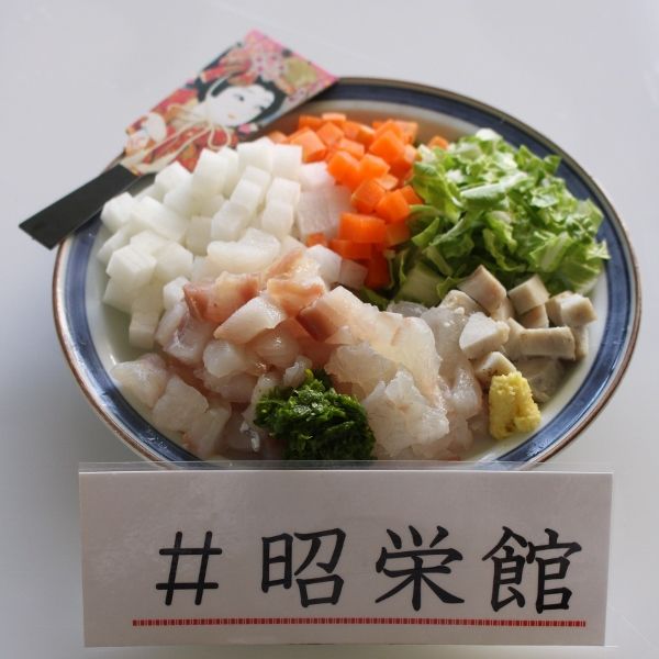 ↑赤い鯛の器に盛り込んであるのは、魚介とお野菜の雑炊仕立て。