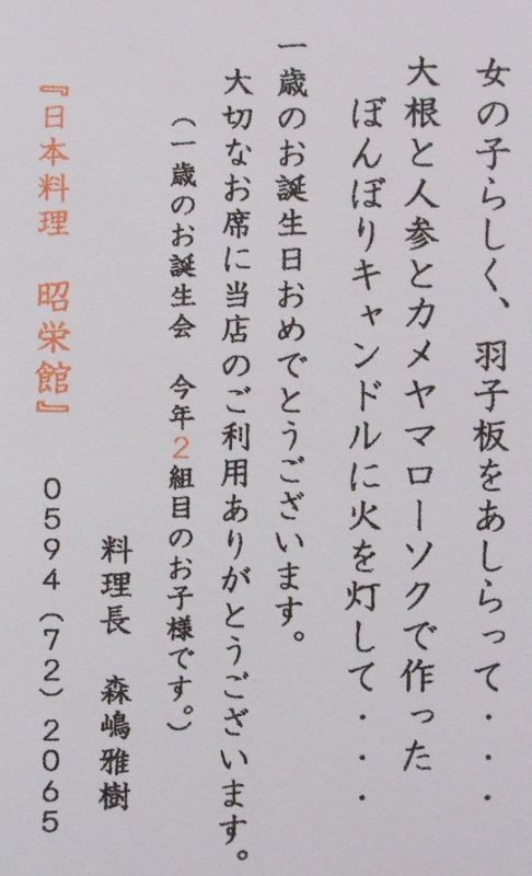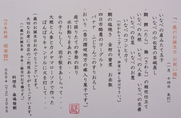 当店大人気の一歳のお誕生日お祝い膳のこと、