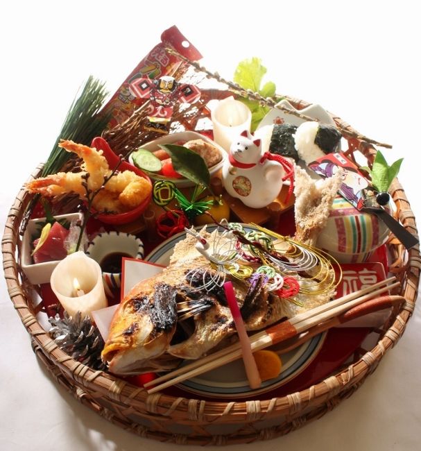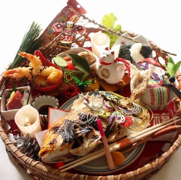 おめでたい朱籠に、連子鯛の姿焼きを中心に、