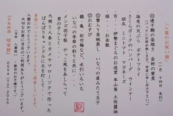昭栄館の入園祝いのお祝い膳は、季節感も盛り込みます。