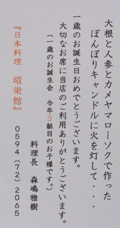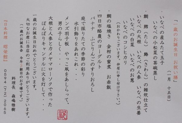 一歳のお誕生会は、是非 いなべの日本料理 昭栄館へ~。