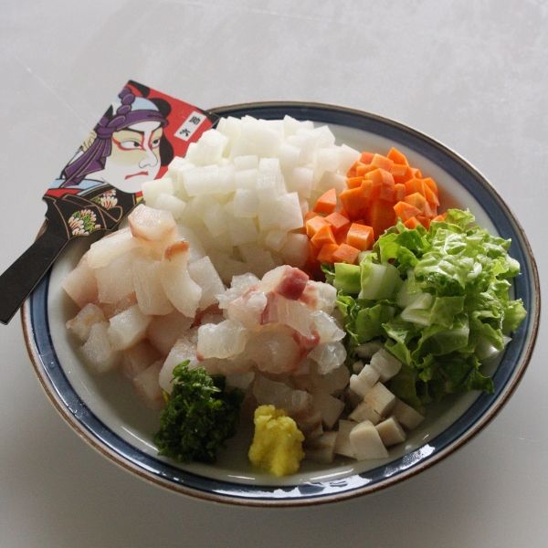 ↑赤い鯛の器に盛り込んであるのは、魚介とお野菜の雑炊仕立て。