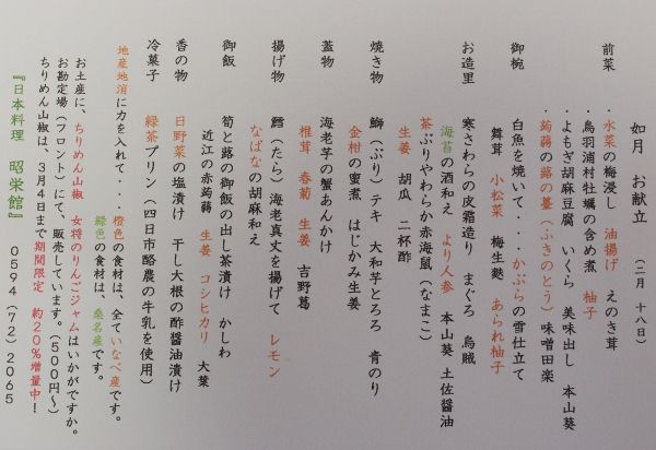 「料理長の日記」  三重県いなべ市             阿下喜(あげき)の日本料理 昭栄館
