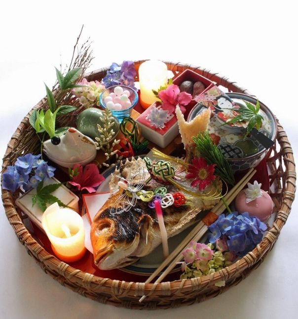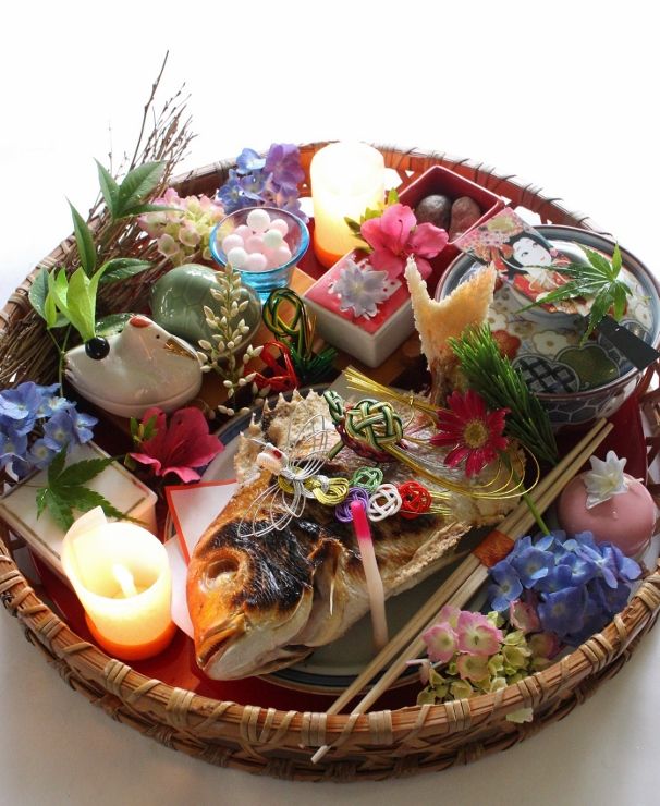 おめでたい朱籠に、連子鯛の姿焼きを中心に、