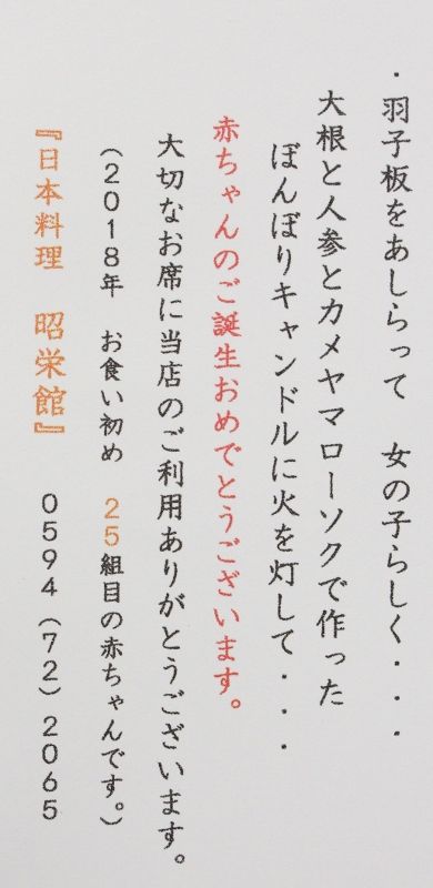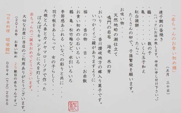 大切な赤ちゃんのお食い初めのお席は、是非 いなべの昭栄館へ~。