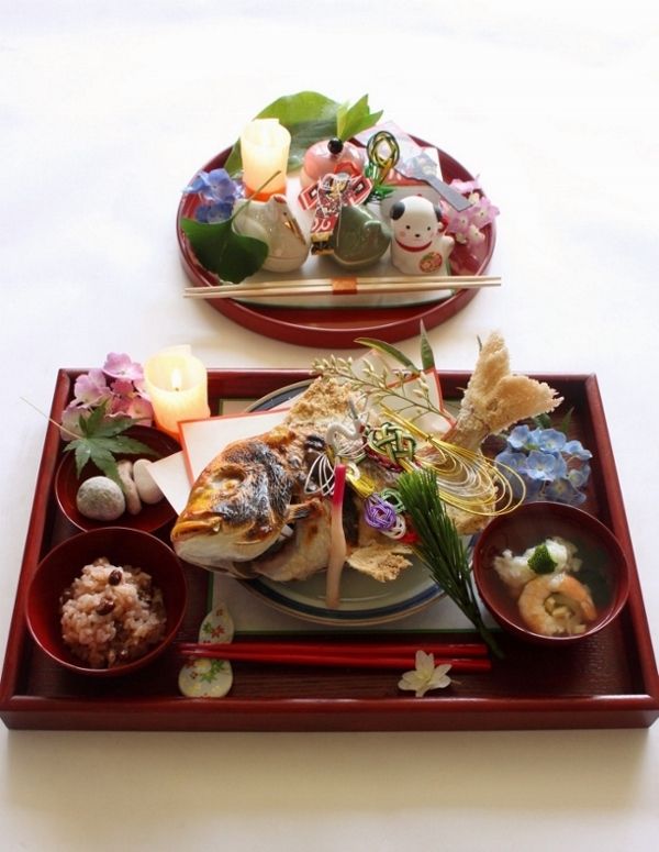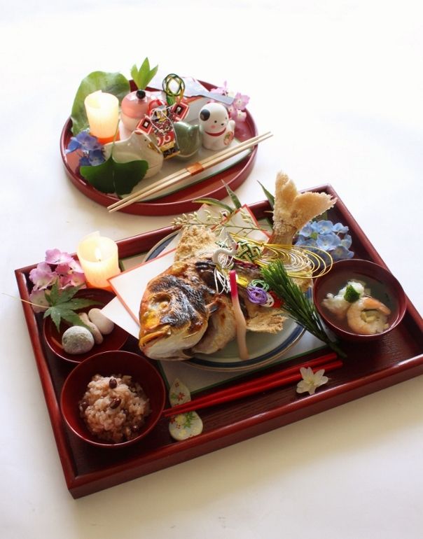 ↑ 手前のお盆には、連子鯛の姿焼きをはじめ、