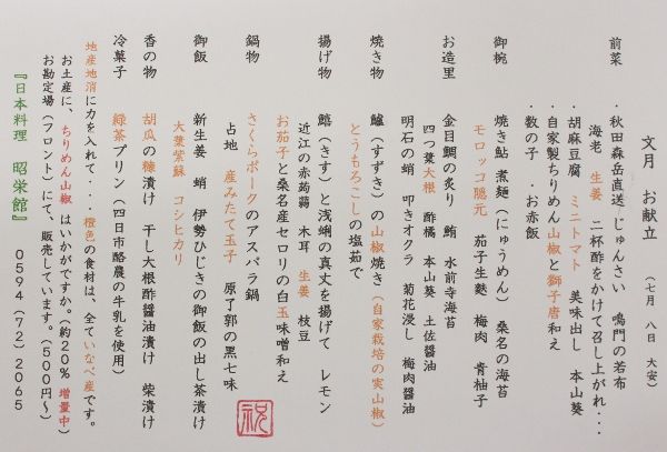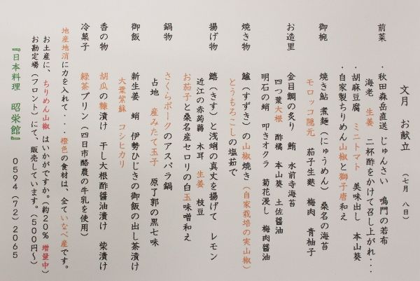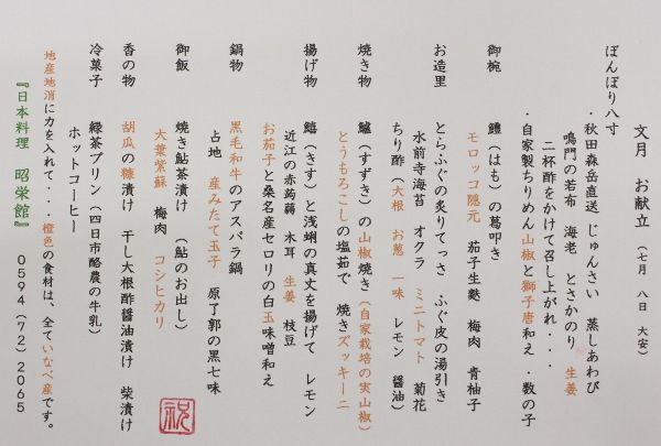 「料理長の日記」  三重県いなべ市             阿下喜(あげき)の日本料理 昭栄館