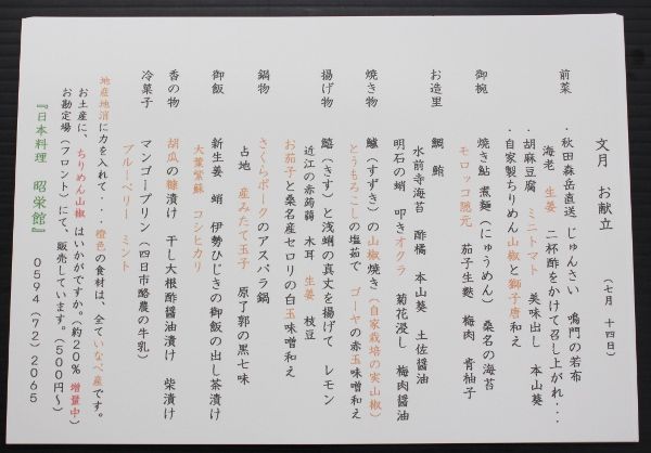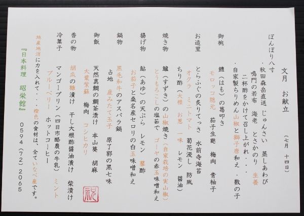 「料理長の日記」  三重県いなべ市             阿下喜(あげき)の日本料理 昭栄館