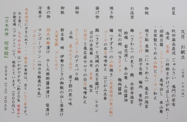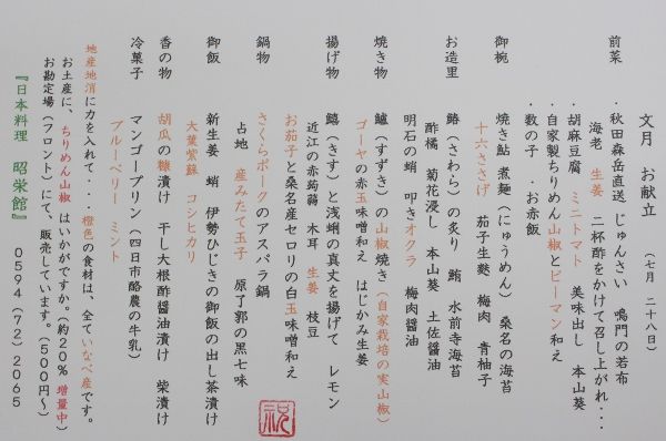 「料理長の日記」  三重県いなべ市             阿下喜(あげき)の日本料理 昭栄館