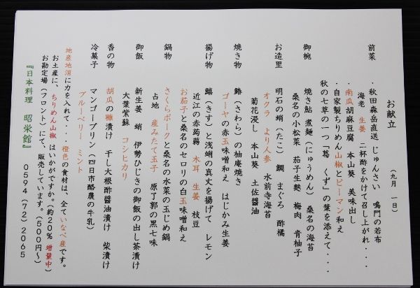 「料理長の日記」  三重県いなべ市             阿下喜(あげき)の日本料理 昭栄館