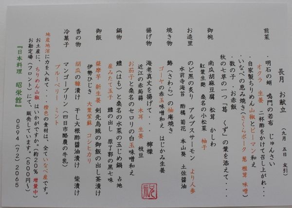 「料理長の日記」  三重県いなべ市             阿下喜(あげき)の日本料理 昭栄館