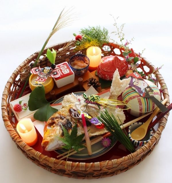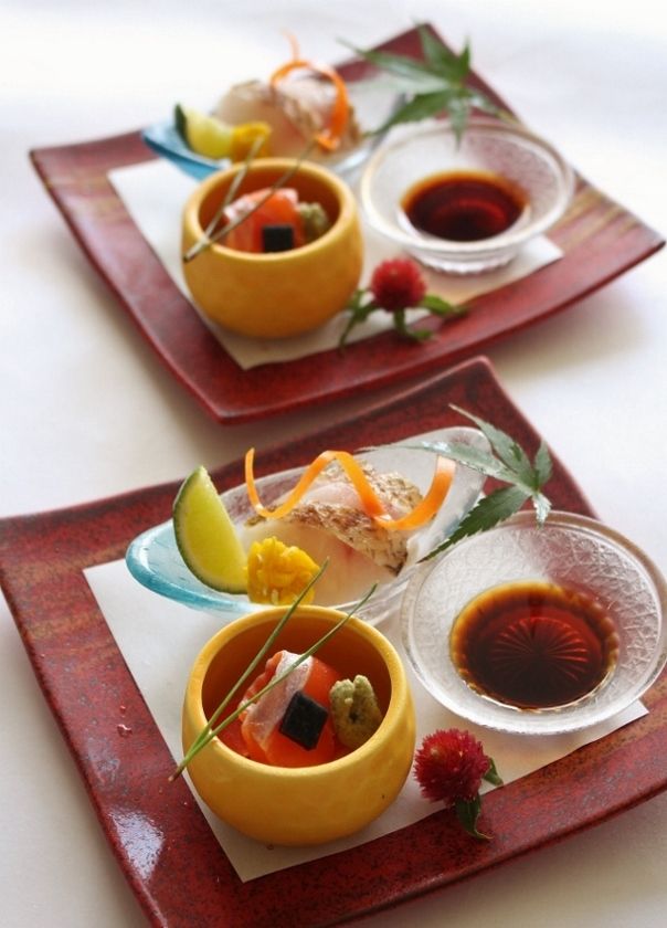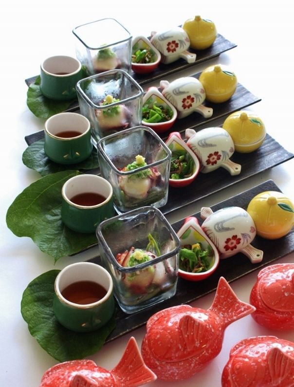 手前の鯛の器には、一口お赤飯を盛り込んでいます。