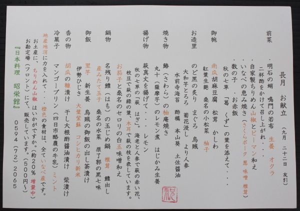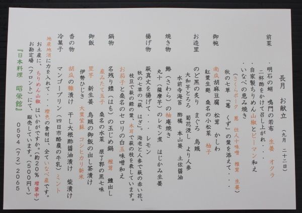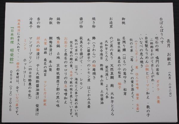「料理長の日記」  三重県いなべ市             阿下喜(あげき)の日本料理 昭栄館